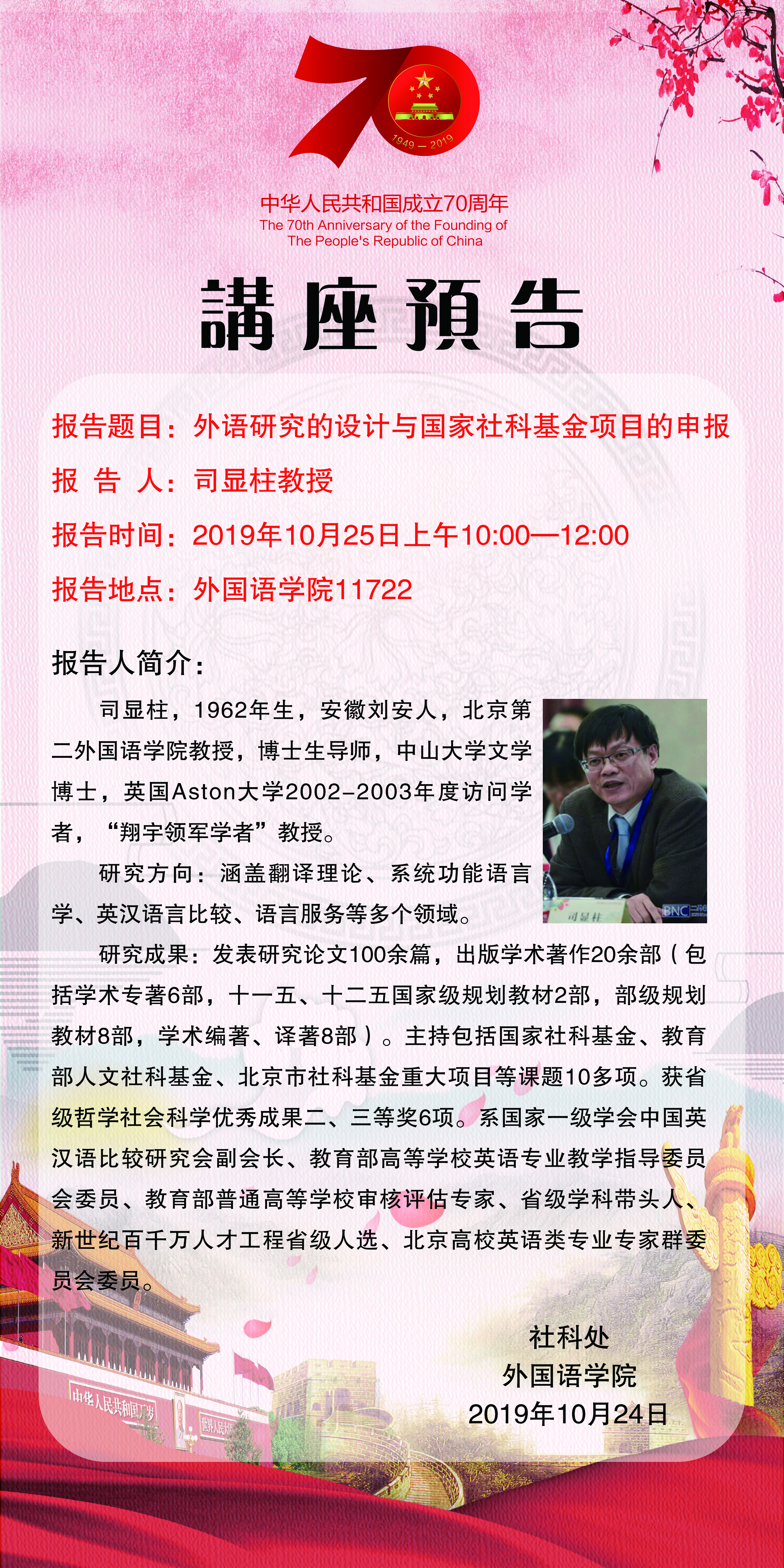 【预告】 北京第二外国语学院司显柱教授应外国语学院邀请来威尼斯官网作学术报告