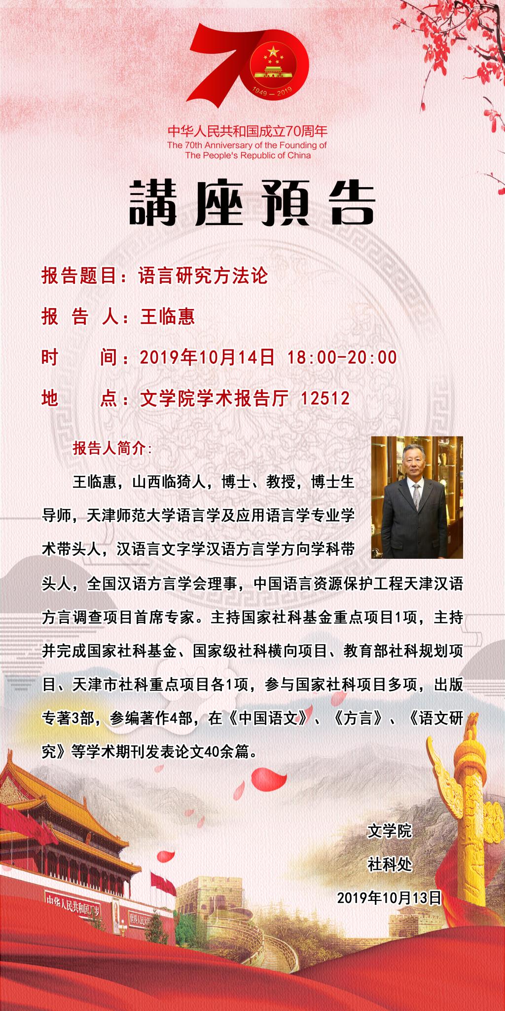 【预告】天津师范大学王临惠教授应文学院邀请来威尼斯官网作学术报告