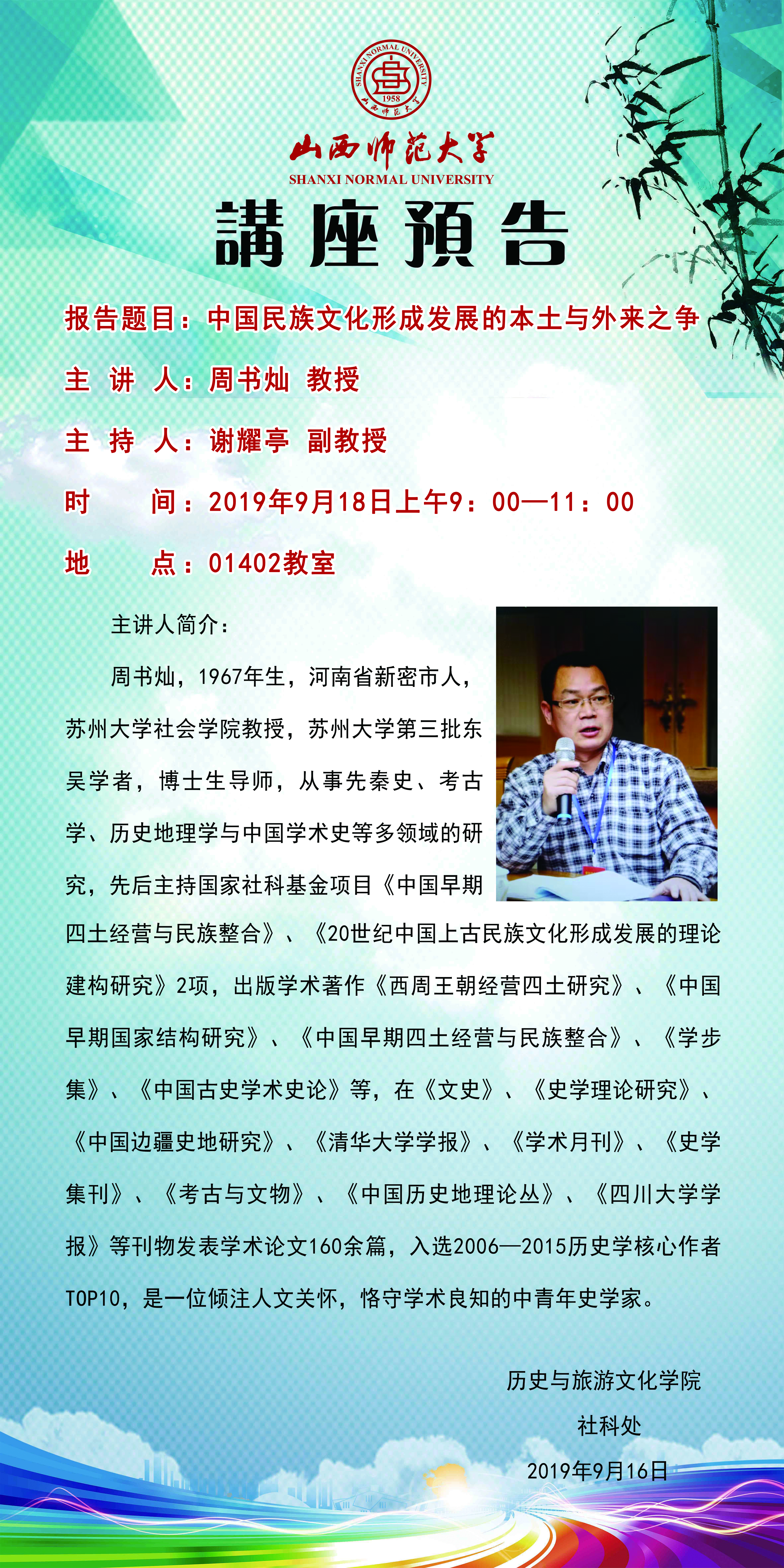 【预告】 苏州大学周书灿教授应历史与旅游文化学院邀请来威尼斯官网作学术报告