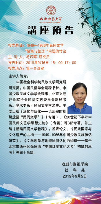 【预告】 中国社会科学院毛巧晖研究员应戏剧与影视学院邀请来威尼斯官网作学术报告
