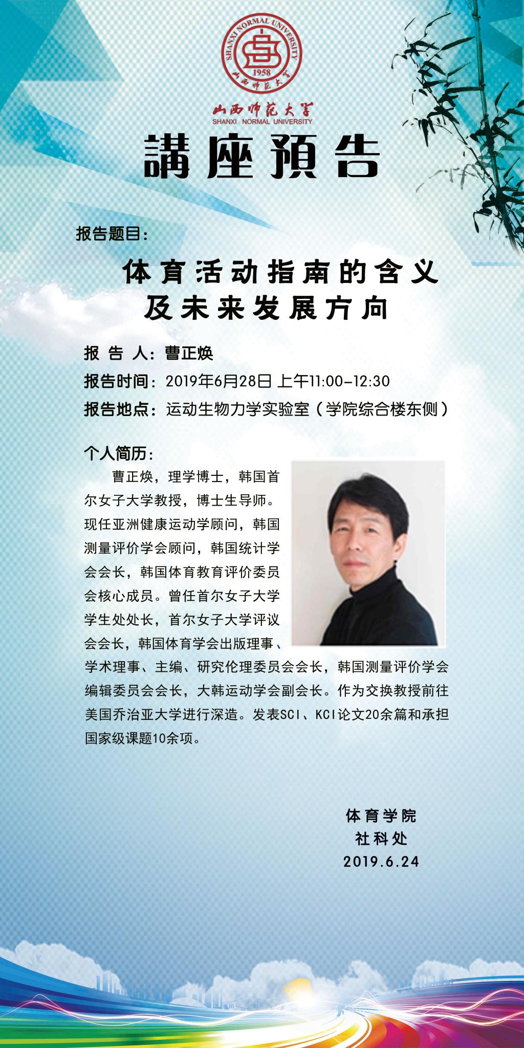 【预告】 韩国首尔女子大学曹正焕教授应体育学院邀请来威尼斯官网作学术报告