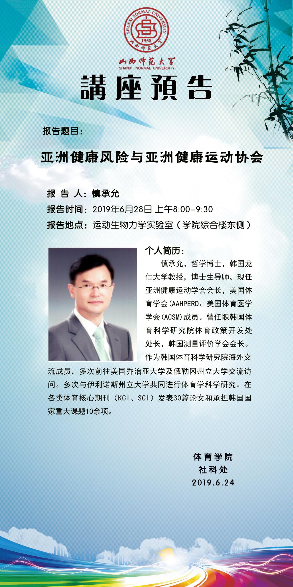 【预告】 韩国龙仁大学慎承允教授应体育学院邀请来威尼斯官网作学术报告