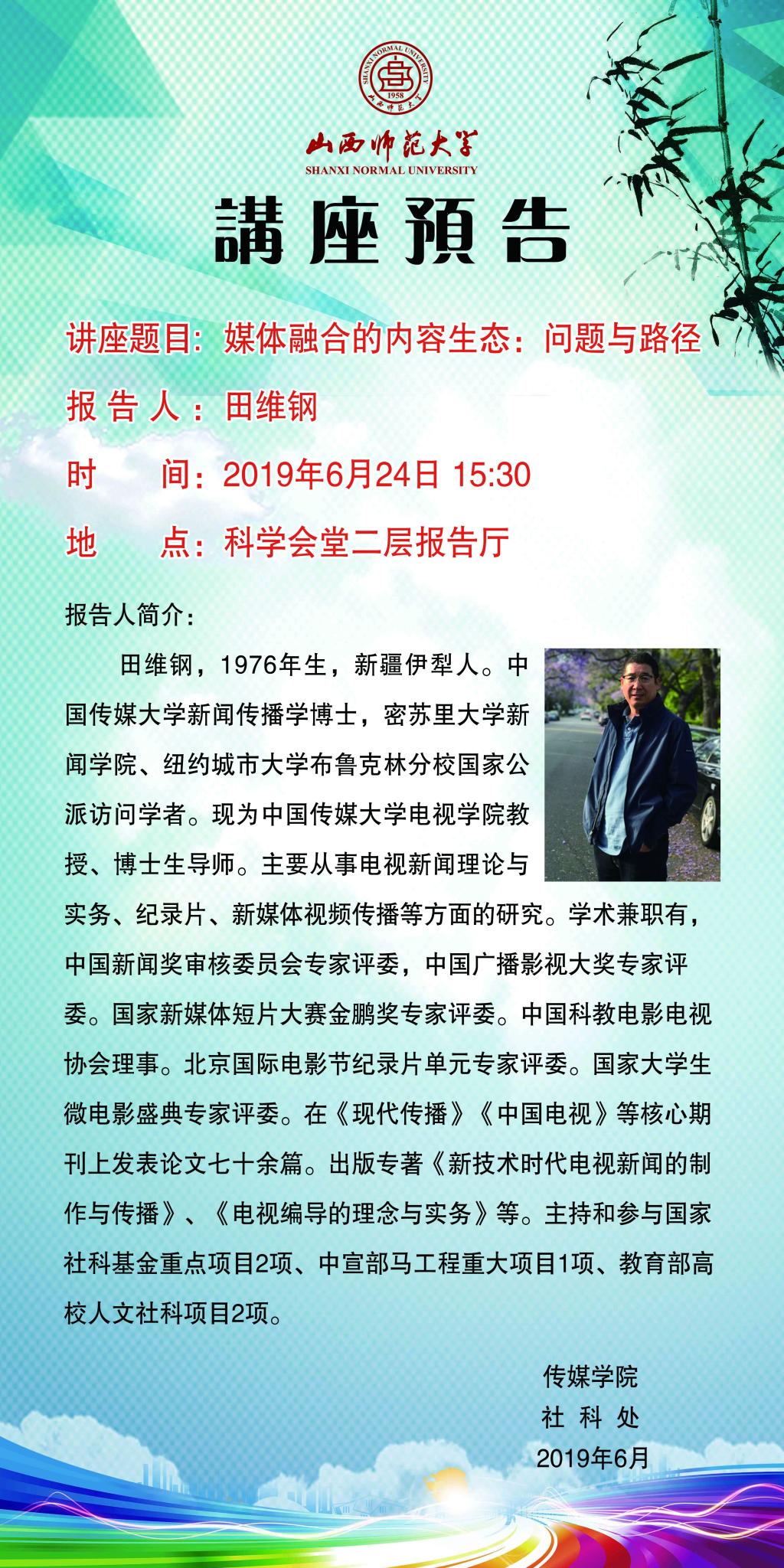 【预告】 中国传媒大学田维钢教授应传媒学院邀请来威尼斯官网作学术报告