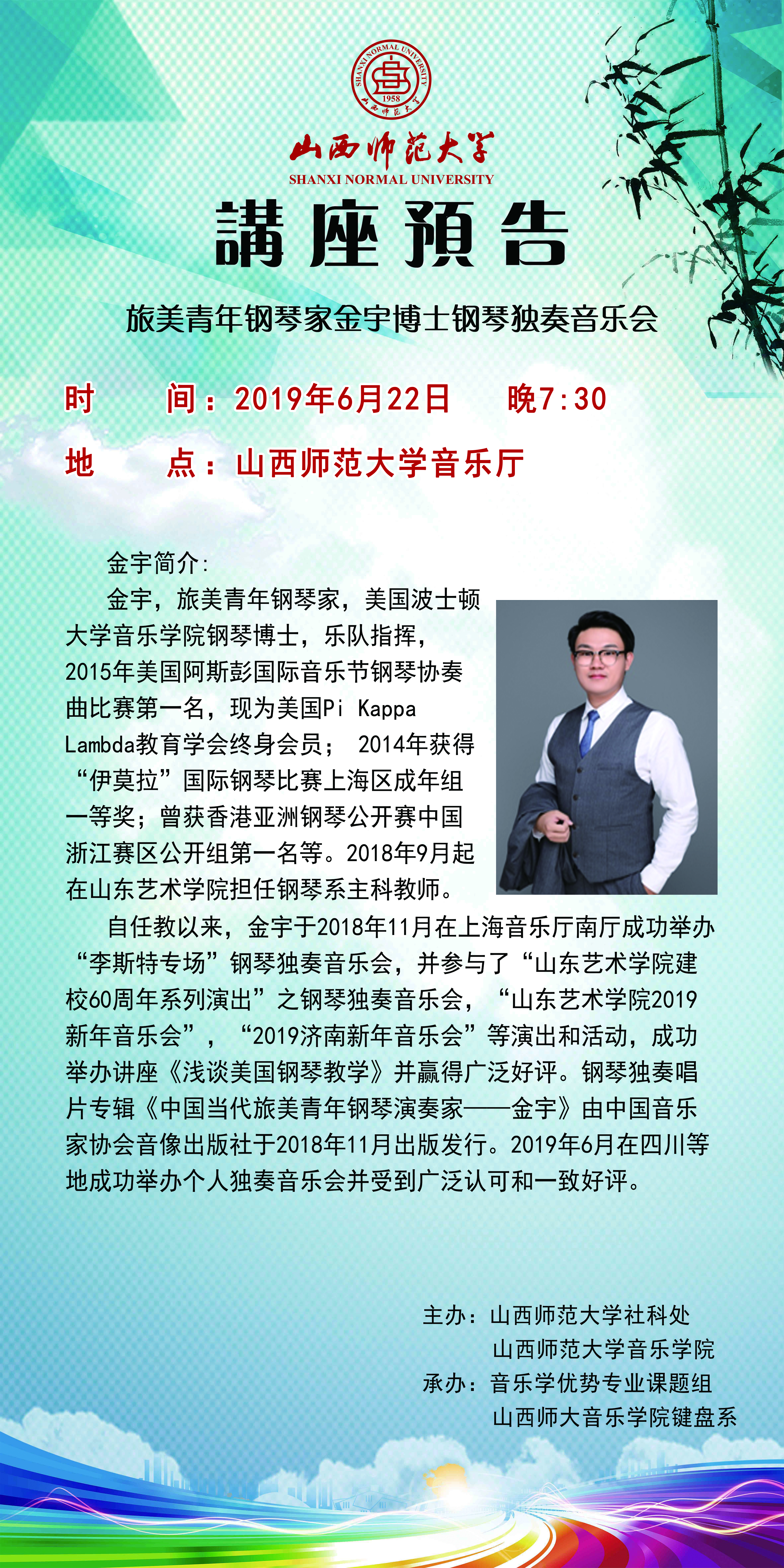 【预告】 旅美青年钢琴家金宇博士应音乐学院邀请来威尼斯官网举办钢琴独奏音乐会