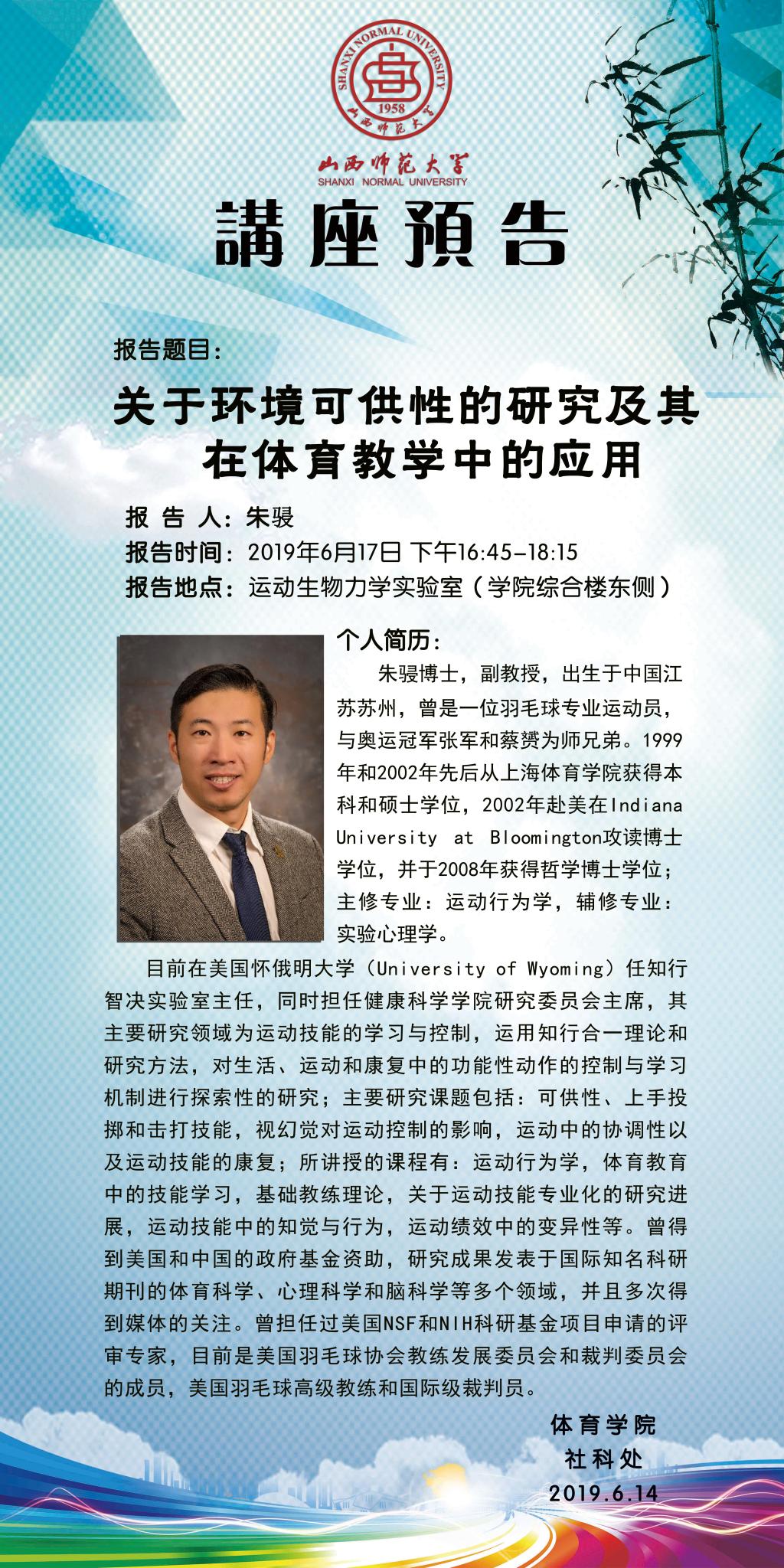 【预告】 美国怀俄明大学朱骎博士应体育学院邀请来威尼斯官网作学术报告