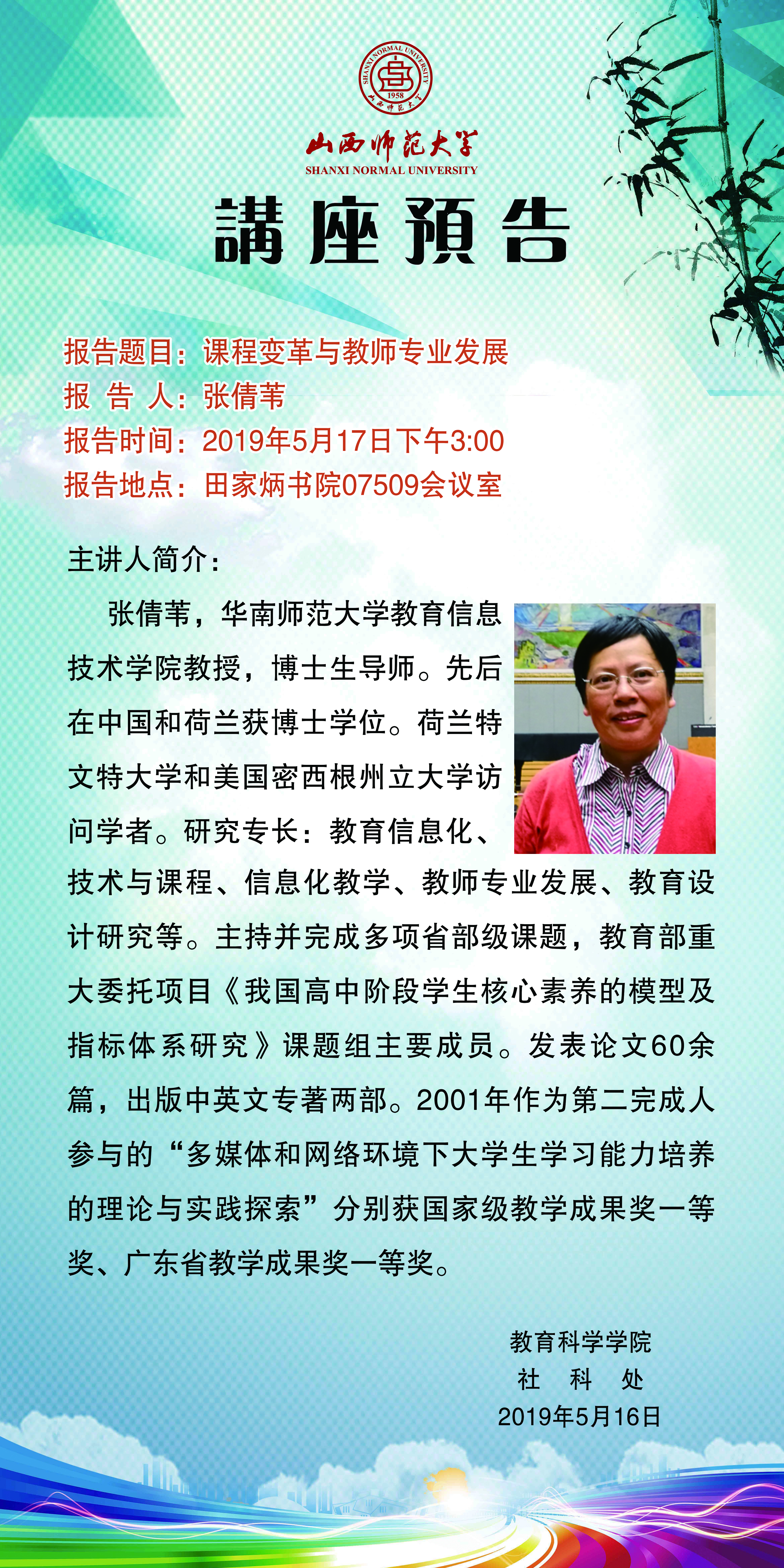 【预告】 华南师范大学张倩苇教授应教育科学学院邀请来威尼斯官网作学术报告