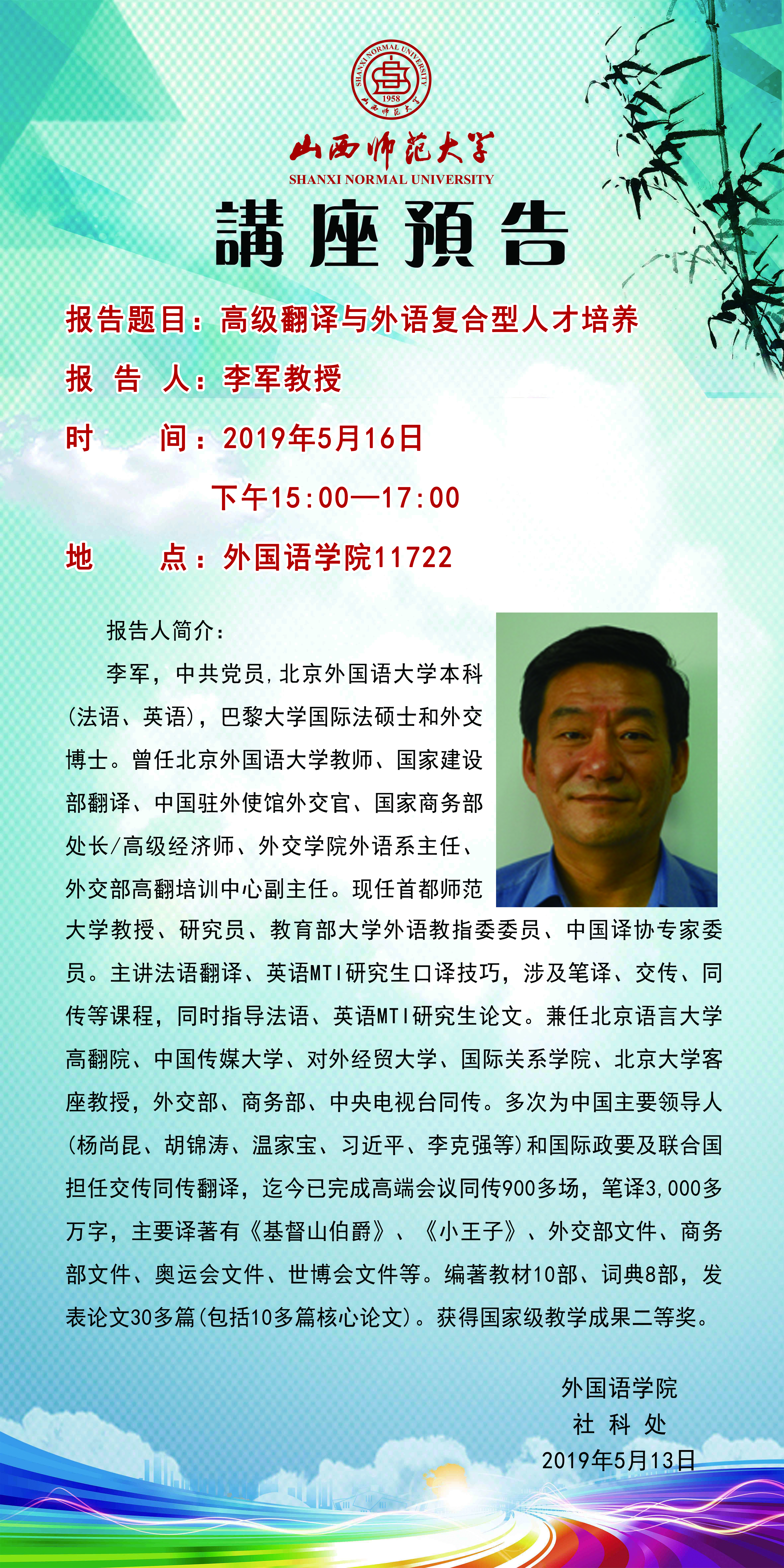 【预告】 首都师范大学李军教授应外国语学院邀请来威尼斯官网作学术报告