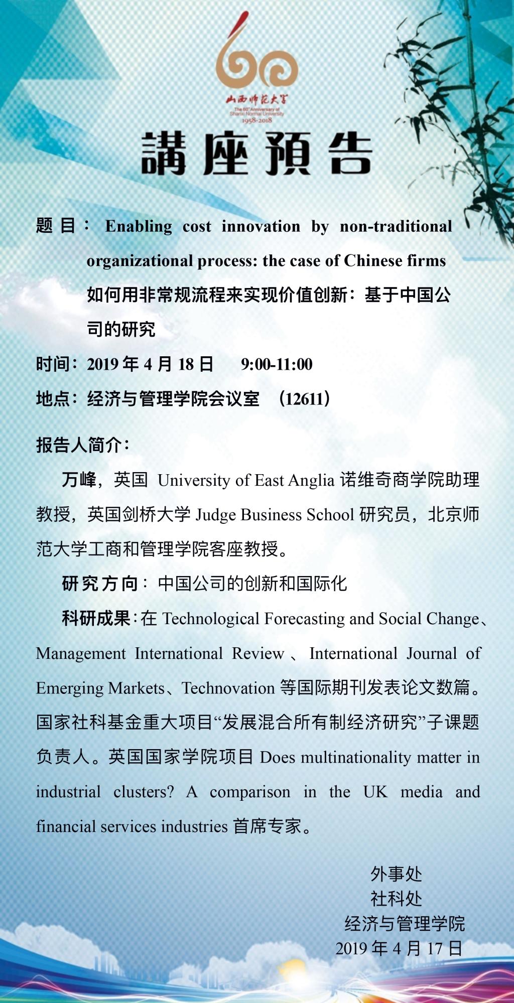 【预告】 英国 University of East Anglia诺维奇商学院助理教授万峰应邀来威尼斯官网作学术报告