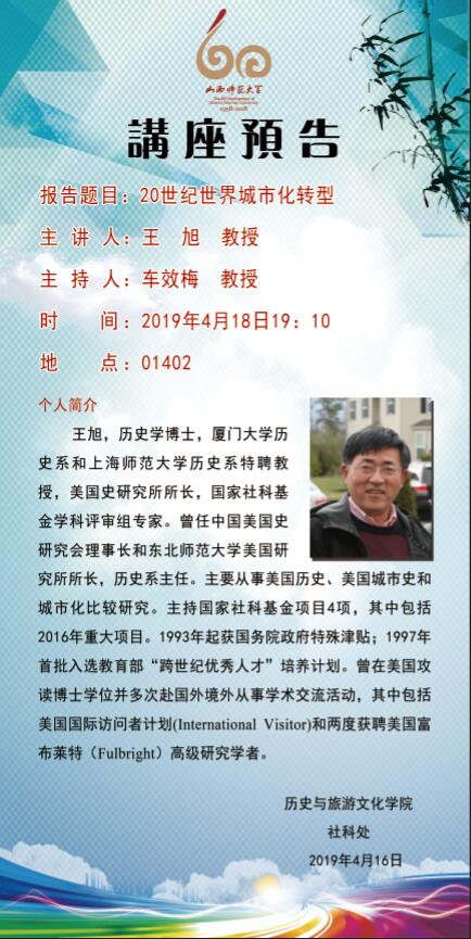 【预告】 厦门大学王旭教授应历史学院邀请来威尼斯官网做学术报告