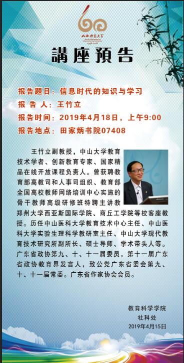 【预告】 中山大学王竹立教授应教育科学学院邀请来威尼斯官网作学术报告