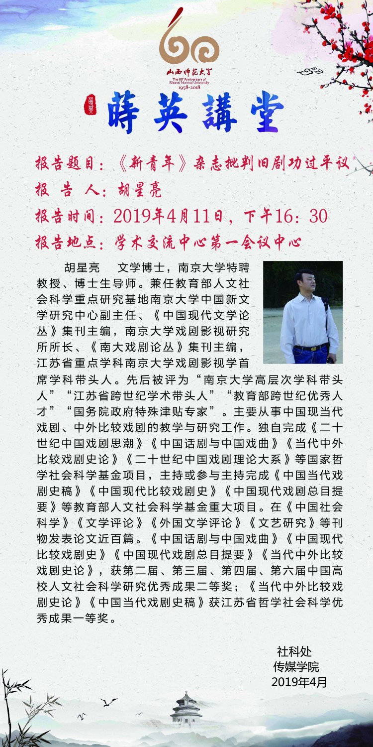 【预告】【莳英讲堂】南京大学胡星亮教授应传媒学院邀请来威尼斯官网作学术报告