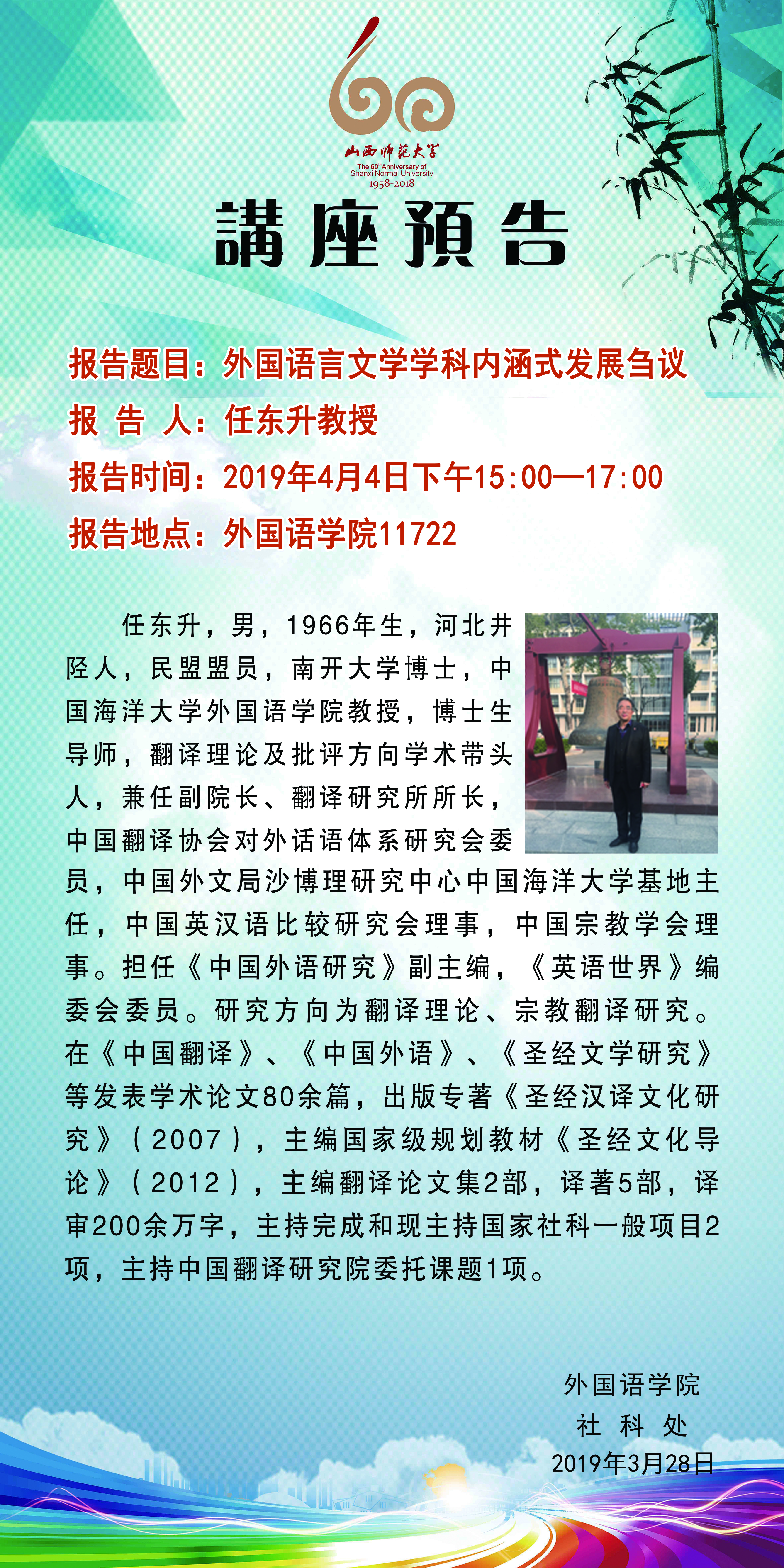 【预告】 中国海洋大学任东升教授应外国语学院邀请来威尼斯官网作学术报告