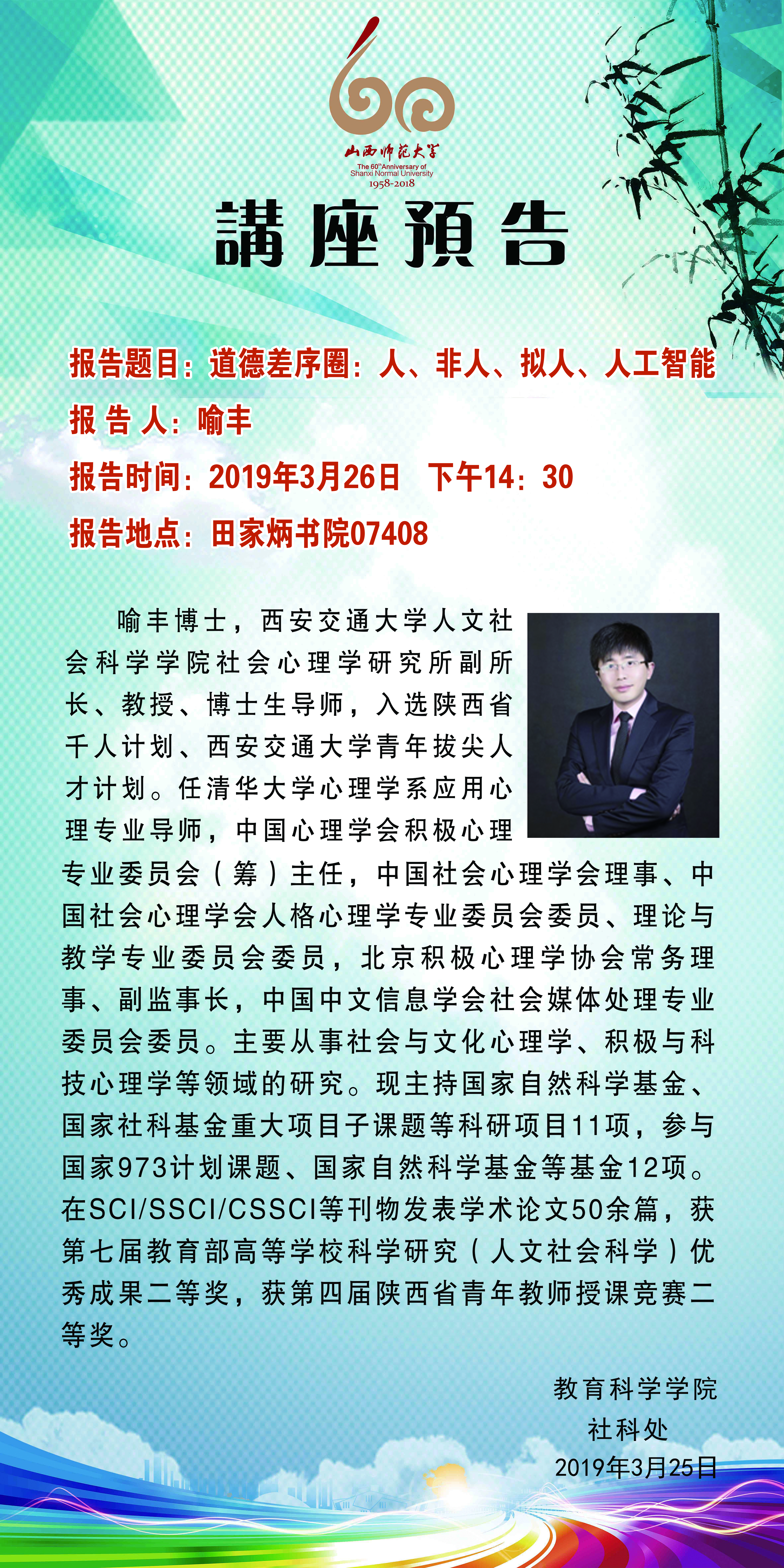 【预告】 西安交通大学喻丰教授应教育科学学院邀请来威尼斯官网作学术报告