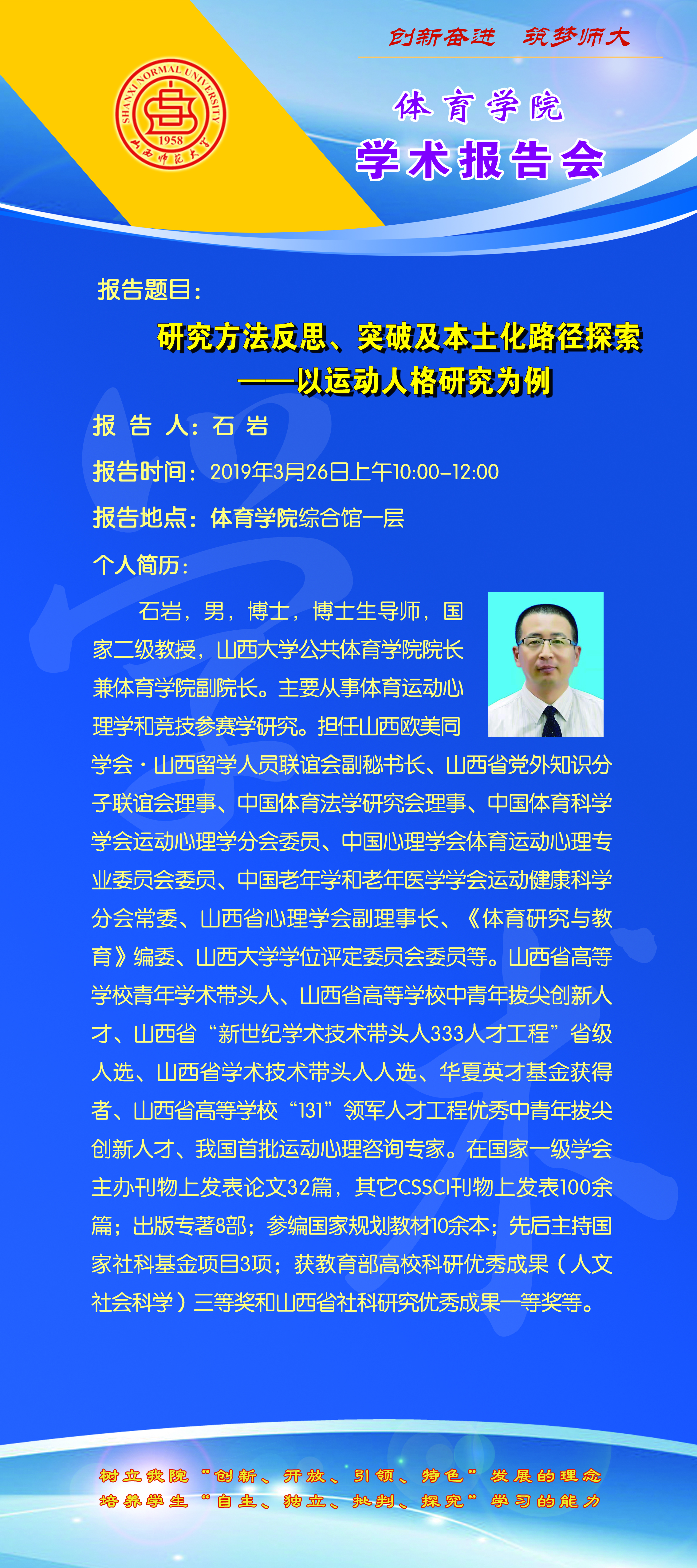 【预告】 山西大学公共体育学院院长石岩教授应体育学院邀请来威尼斯官网作学术报告