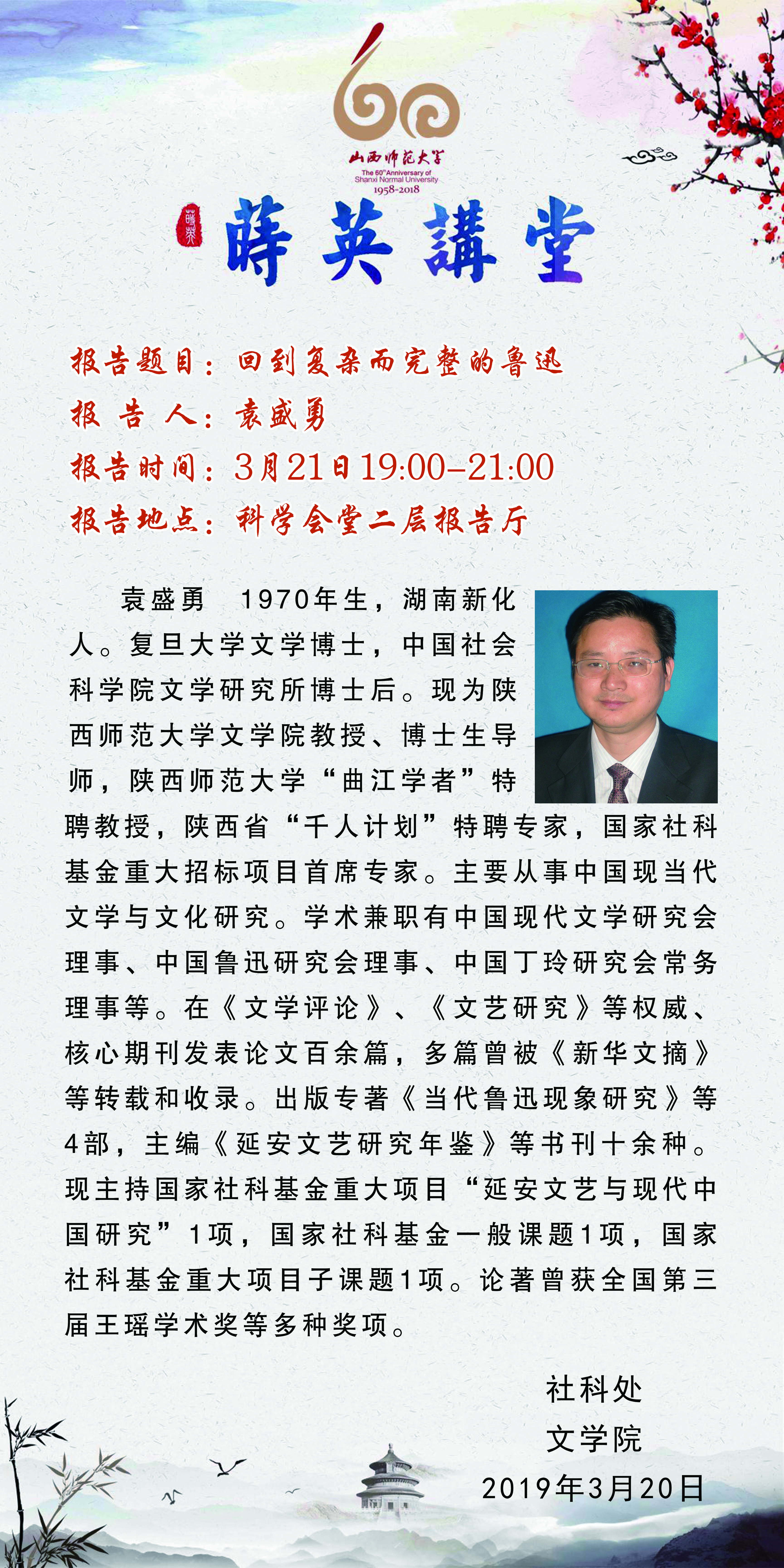 【预告】【莳英讲堂】陕西师范大学袁盛勇教授应文学院邀请来威尼斯官网作学术报告