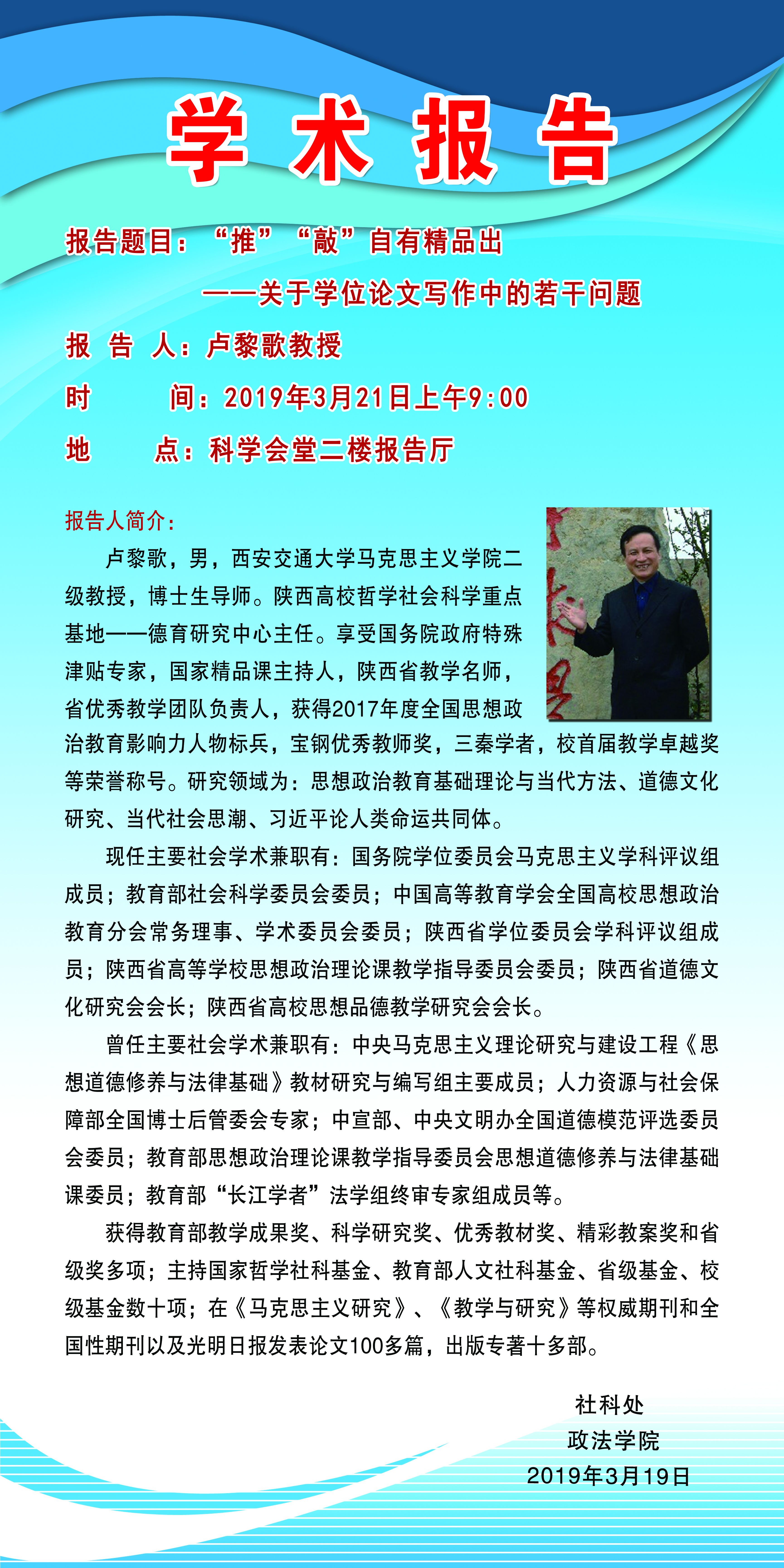 【预告】 西安交通大学卢黎歌教授应政法学院邀请来威尼斯官网作学术报告