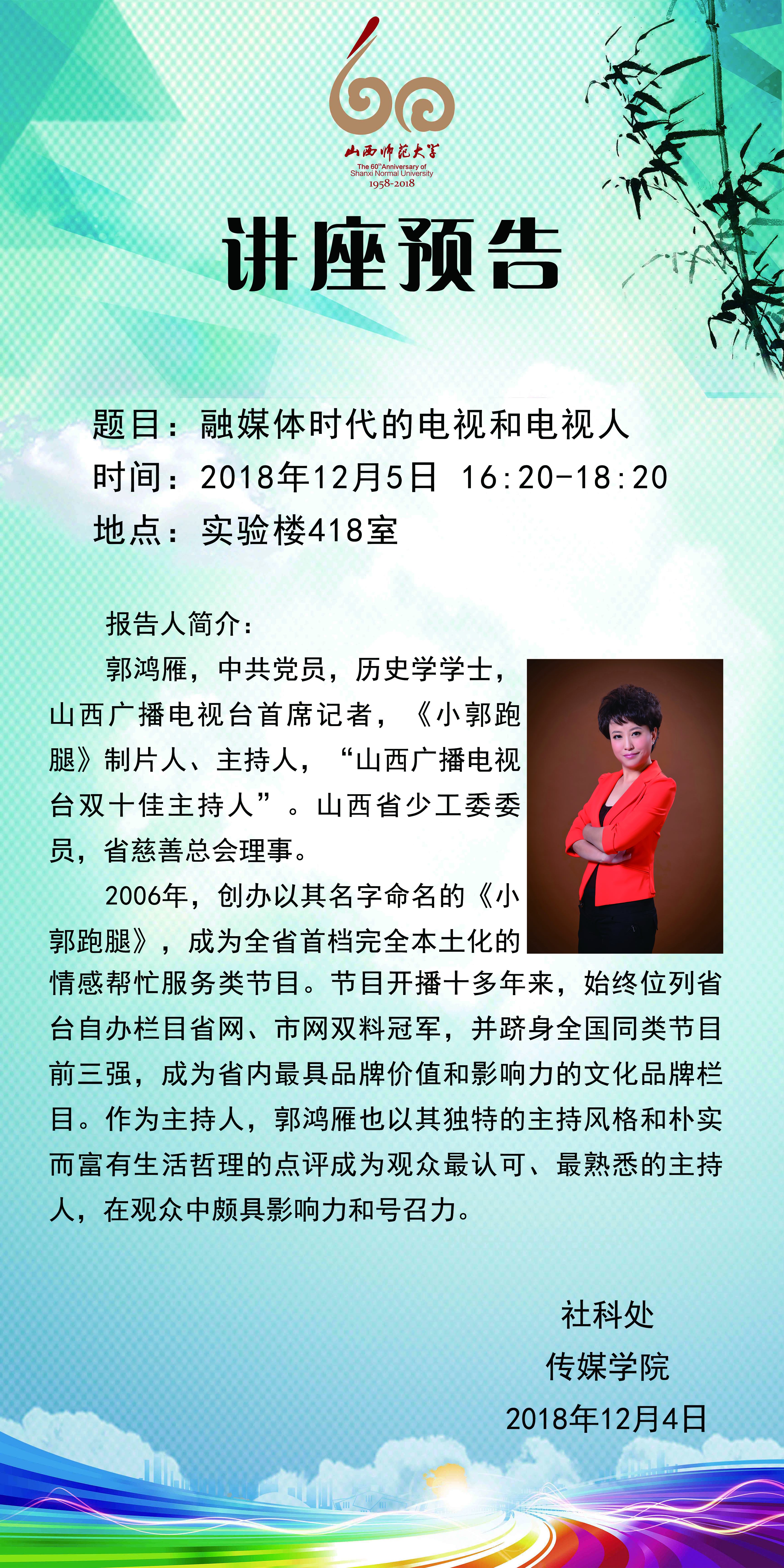 【预告】山西广播电视台首席记者,《小郭跑腿》制片人、主持人郭鸿雁应传媒学院邀请来威尼斯官网作学术报告