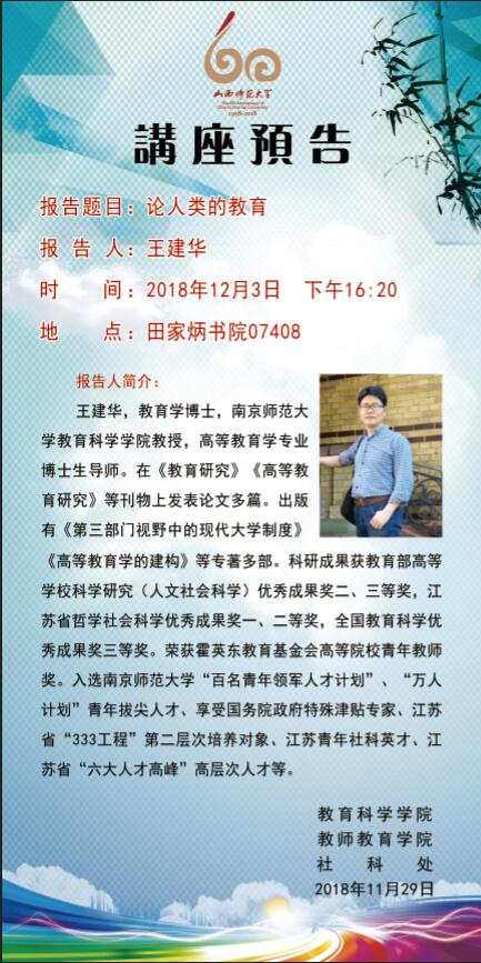 【预告】南京师范大学王建华教授应教育科学学院和教师教育学院邀请来威尼斯官网作学术报告