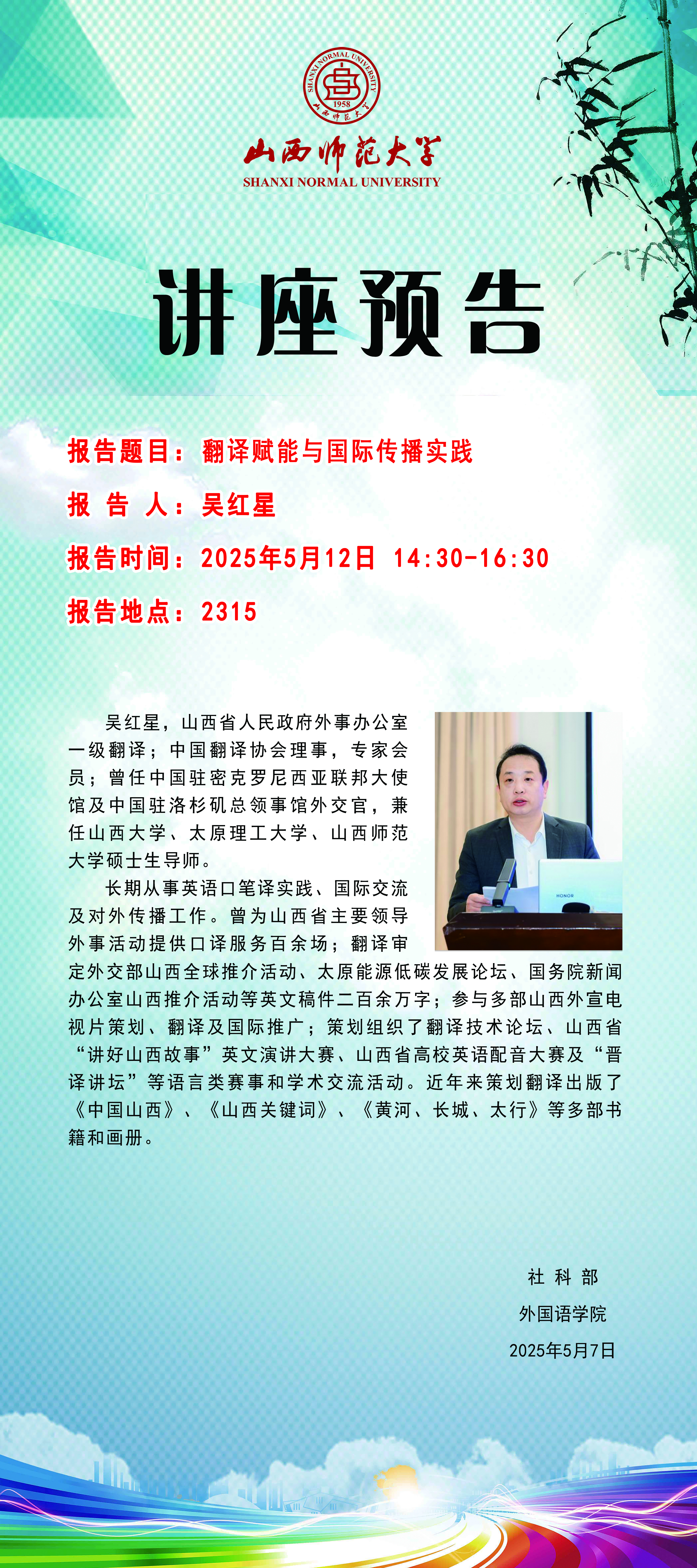 【预告】山西省人民政府外事办公室一级翻译吴红星应外国语学院邀请做学术报告