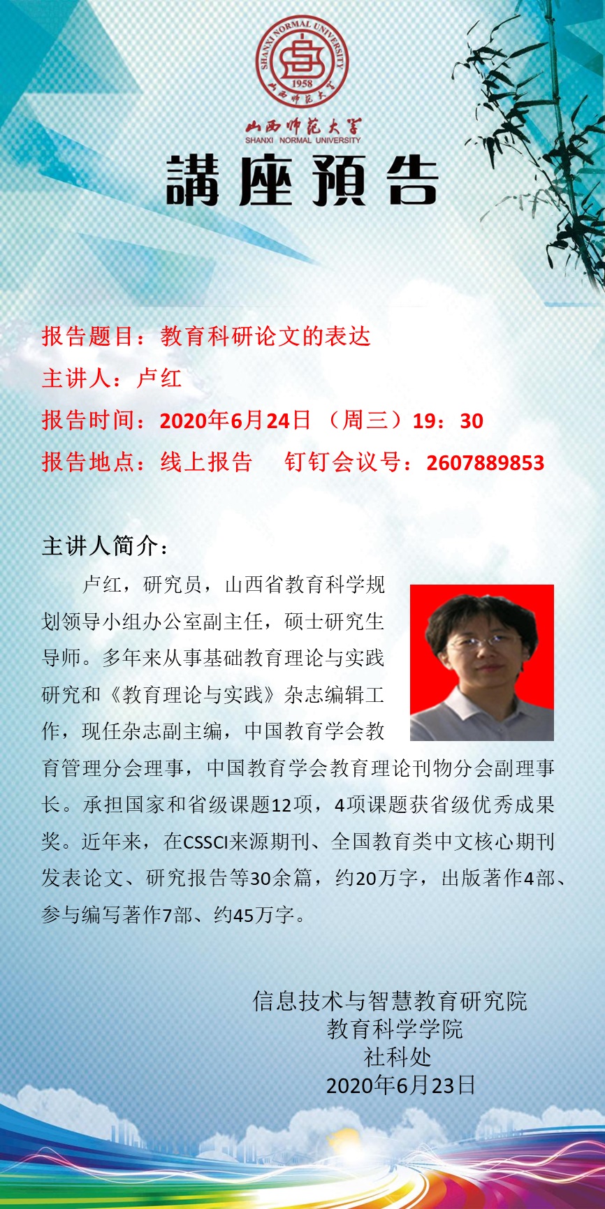 【预告】 山西省教育科学规划领导小组办公室卢红副主任应教育科学学院学院邀请举办视频直播讲座