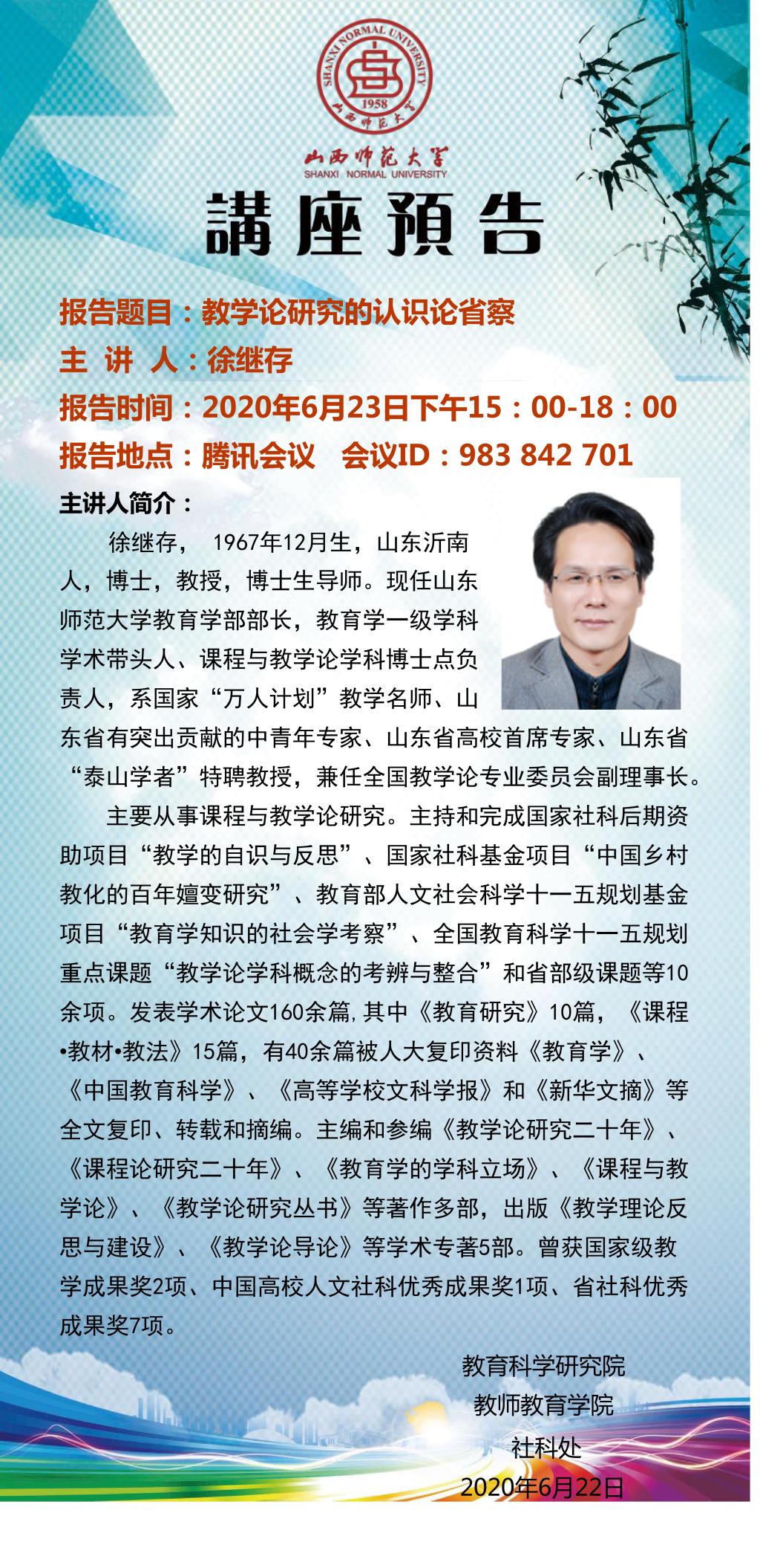 【预告】山东师范大学徐继存教授应教育科学研究院邀请举办视频直播讲座