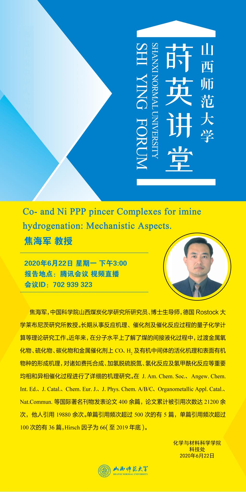 【预告】 中国科学院山西煤炭化学研究所焦海军研究员应邀来威尼斯官网作学术报告