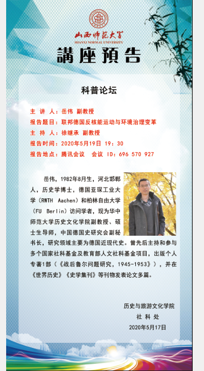 【预告】 华中师范大学岳伟副教授应历史与旅游文化学院邀请举办视频直播讲座