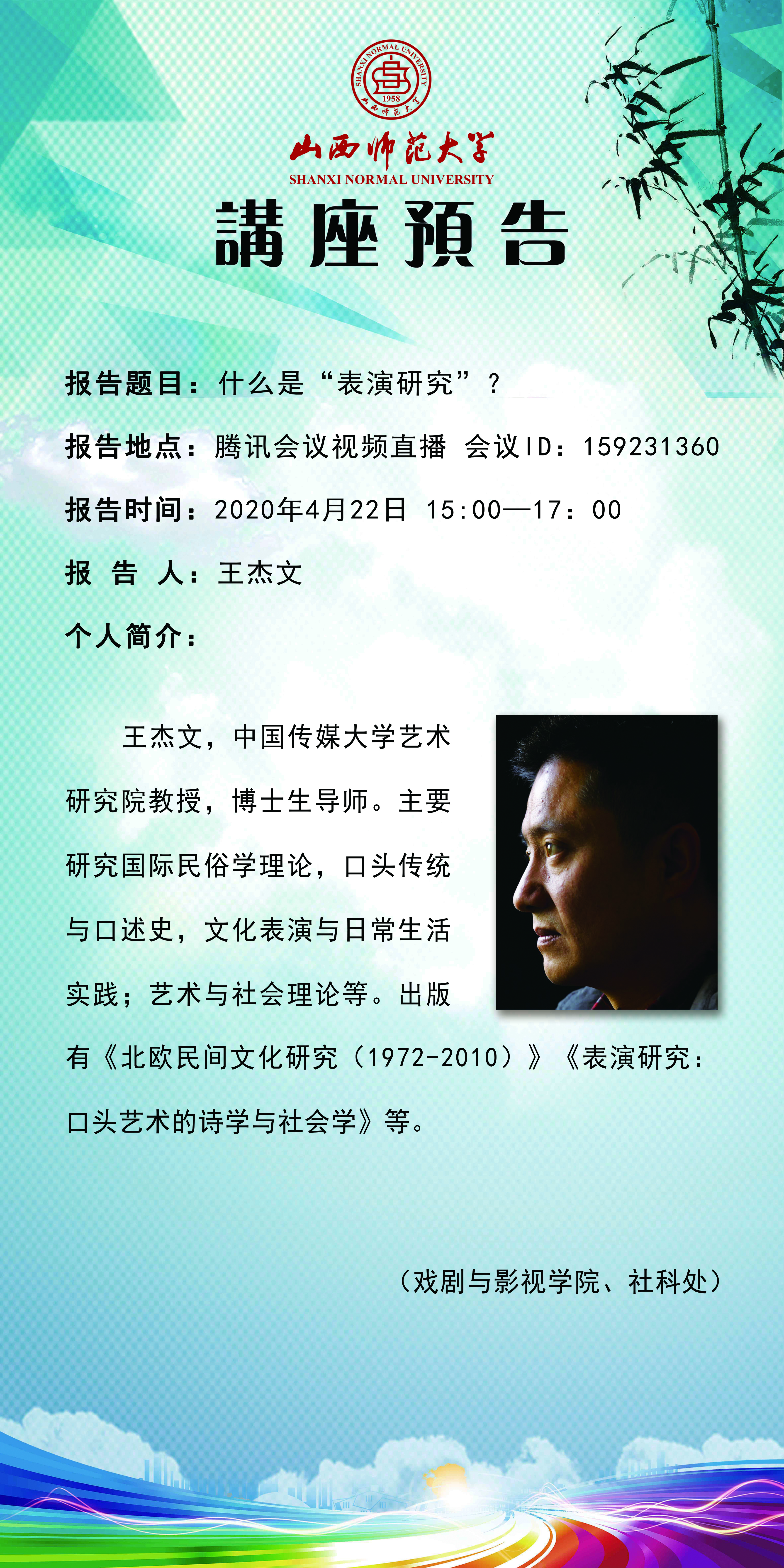 【预告】 中国传媒大学王杰文教授应戏剧与影视学院邀请举办视频直播讲座