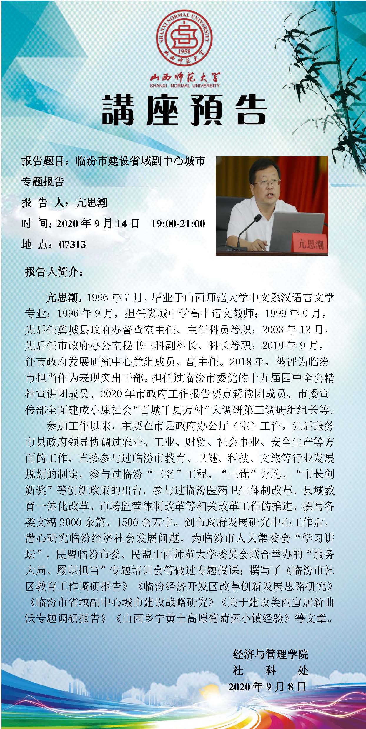 【预告】 临汾市政府发展研究中心副主任亢思潮应经济与管理学院邀请来威尼斯官网作专题报告