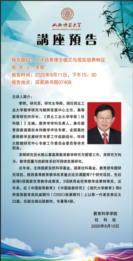 【预告】 西北工业大学李辉研究员应教育科学学院邀请来威尼斯官网作学术报告