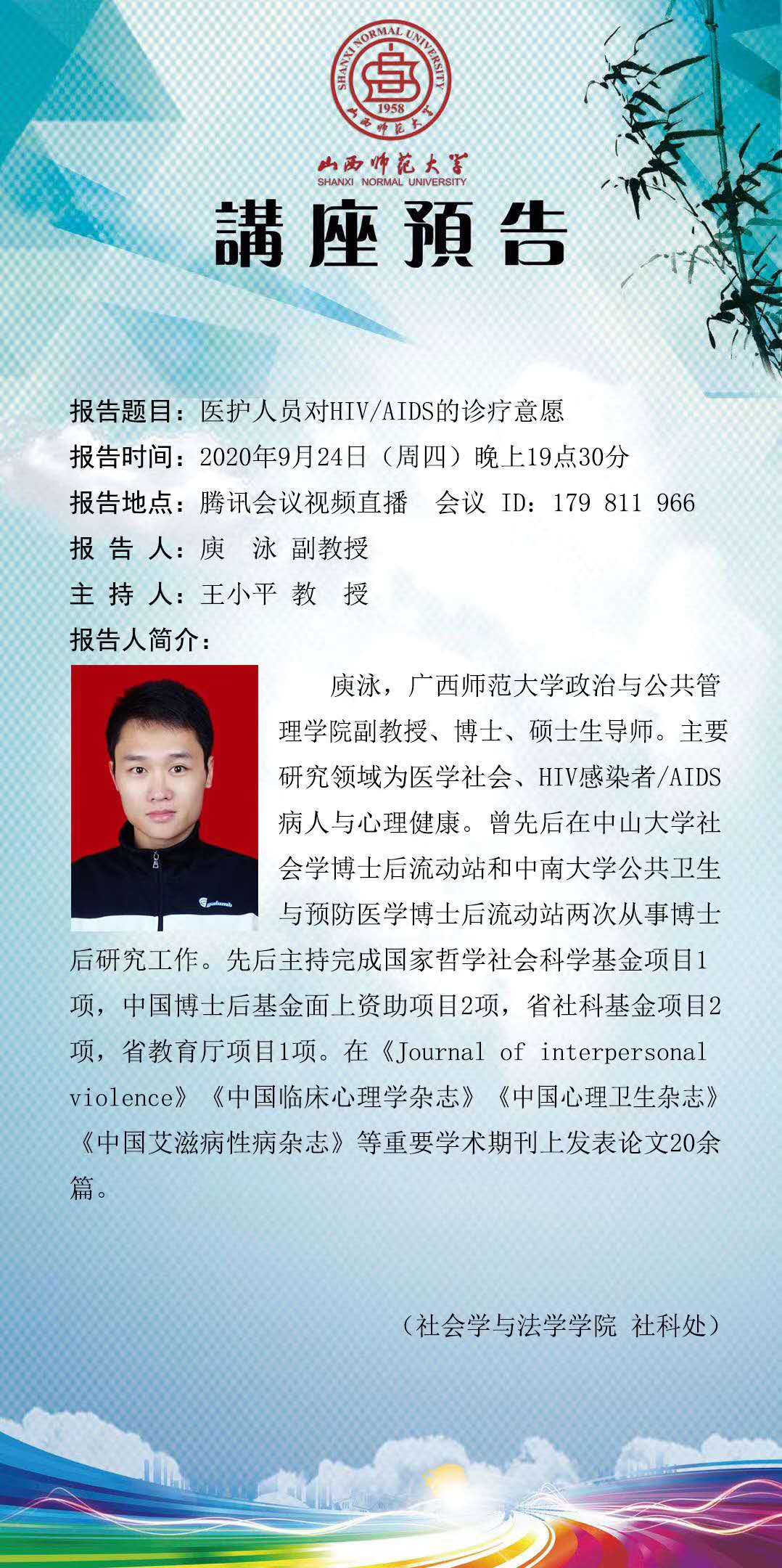 【预告】 广西师范大学政治与公共管理学院庾泳副教授应社会学与法学学院邀请作线上学术报告