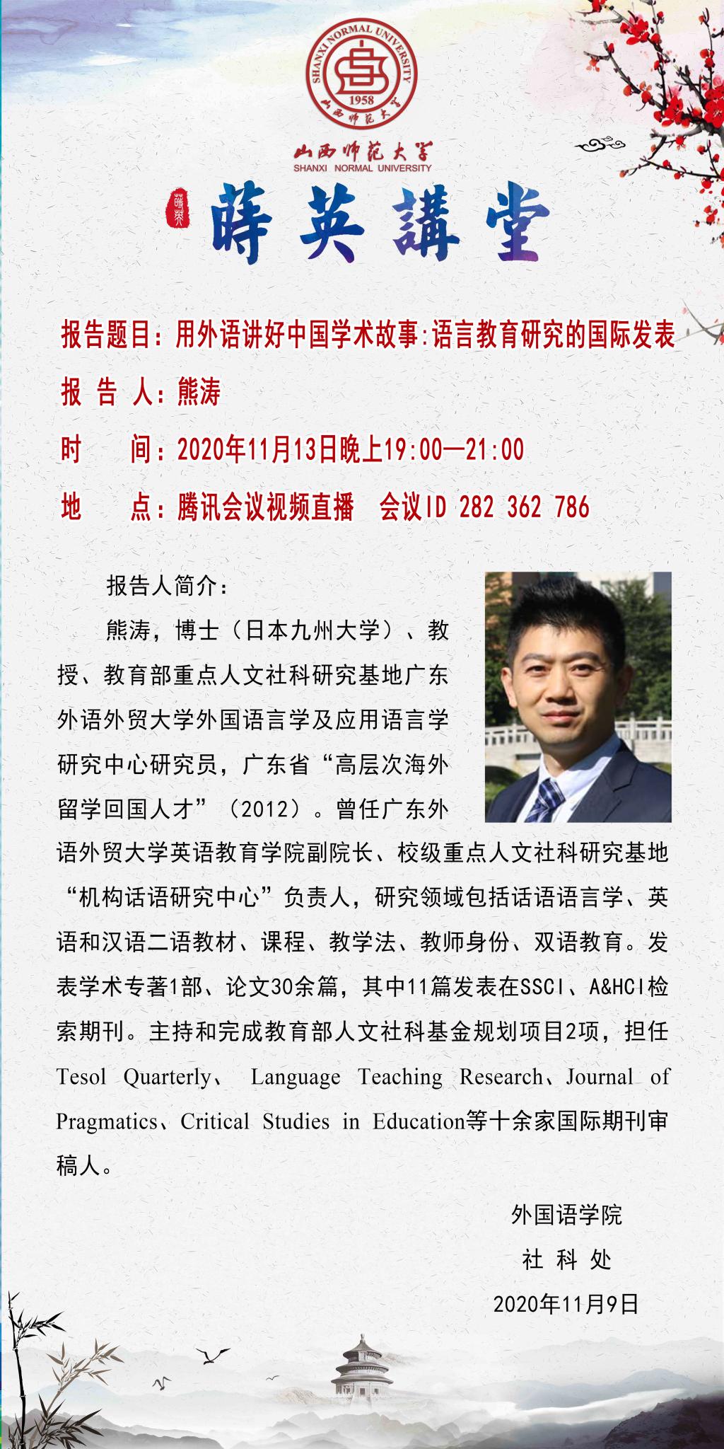 【预告】【莳英讲堂】广东外语外贸大学熊涛教授应外国语学院邀请作线上学术报告