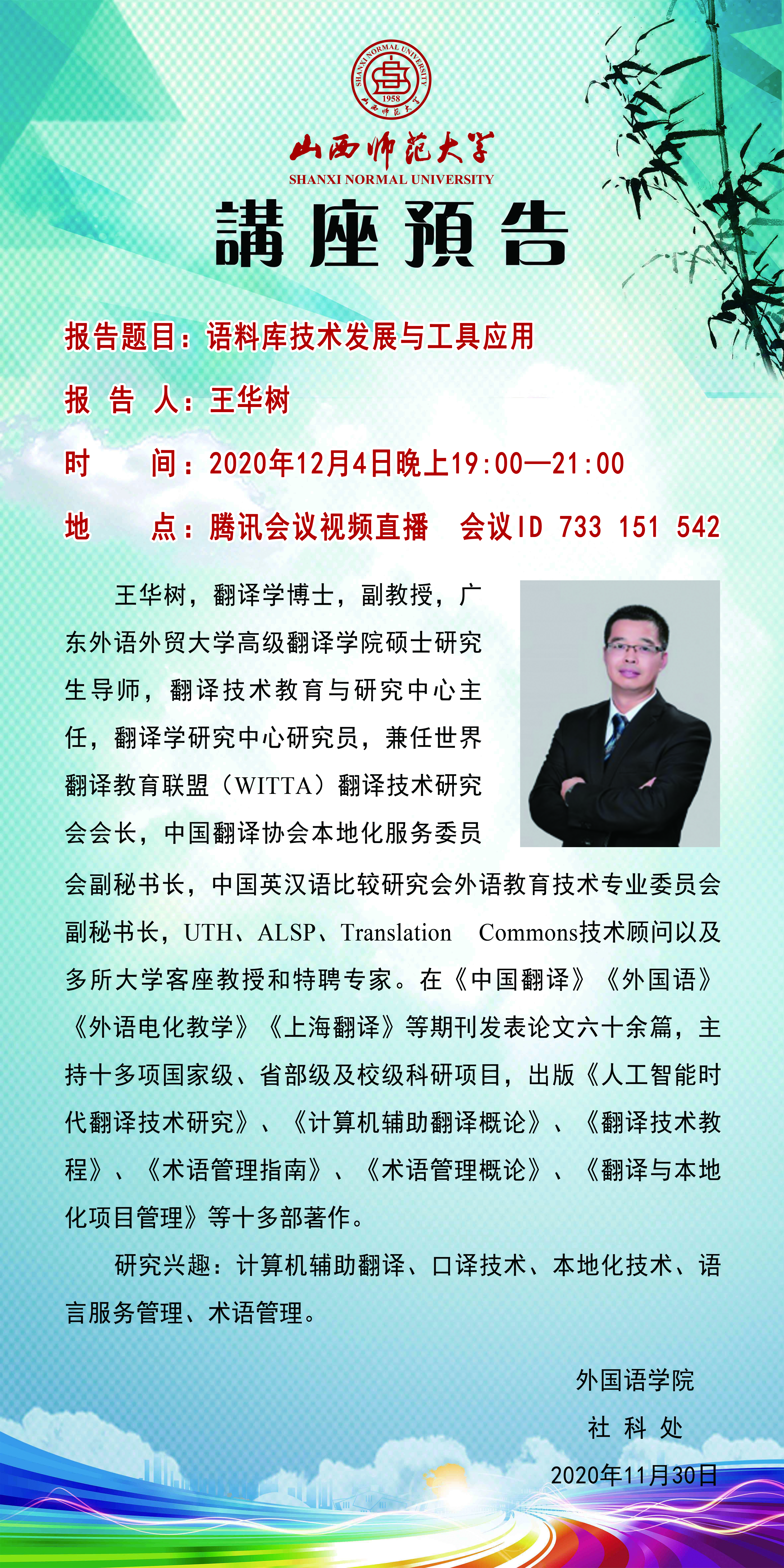 【预告】 广东外语外贸大学王华树副教授应外国语学院邀请作线上学术报告