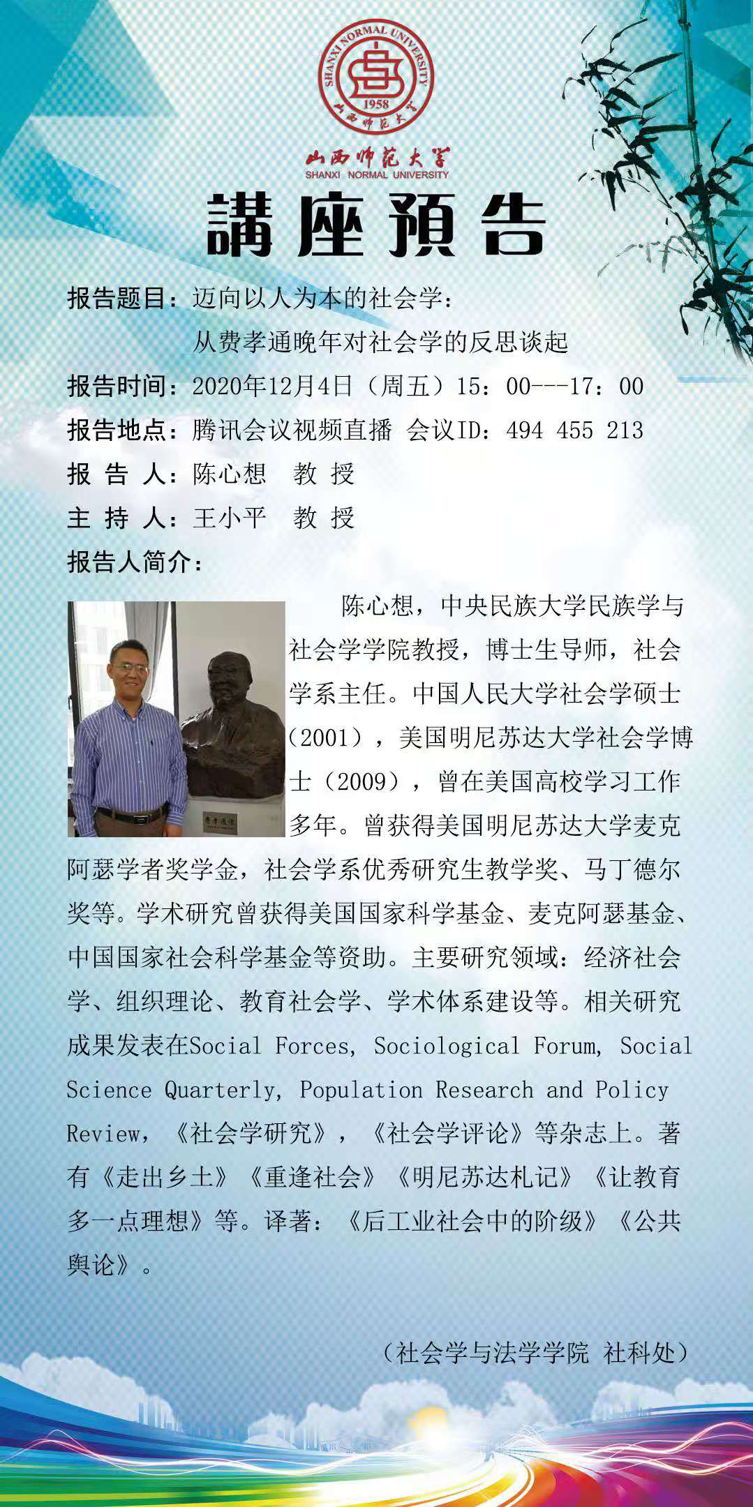 【预告】 中央民族大学民族学与社会学学院陈心想教授应社会学与法学学院邀请作线上学术报告