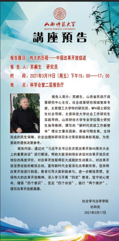【预告】山西省民政厅政策研究中心主任苏顺生研究员应社会学与法学学院邀请来威尼斯官网作学术报告