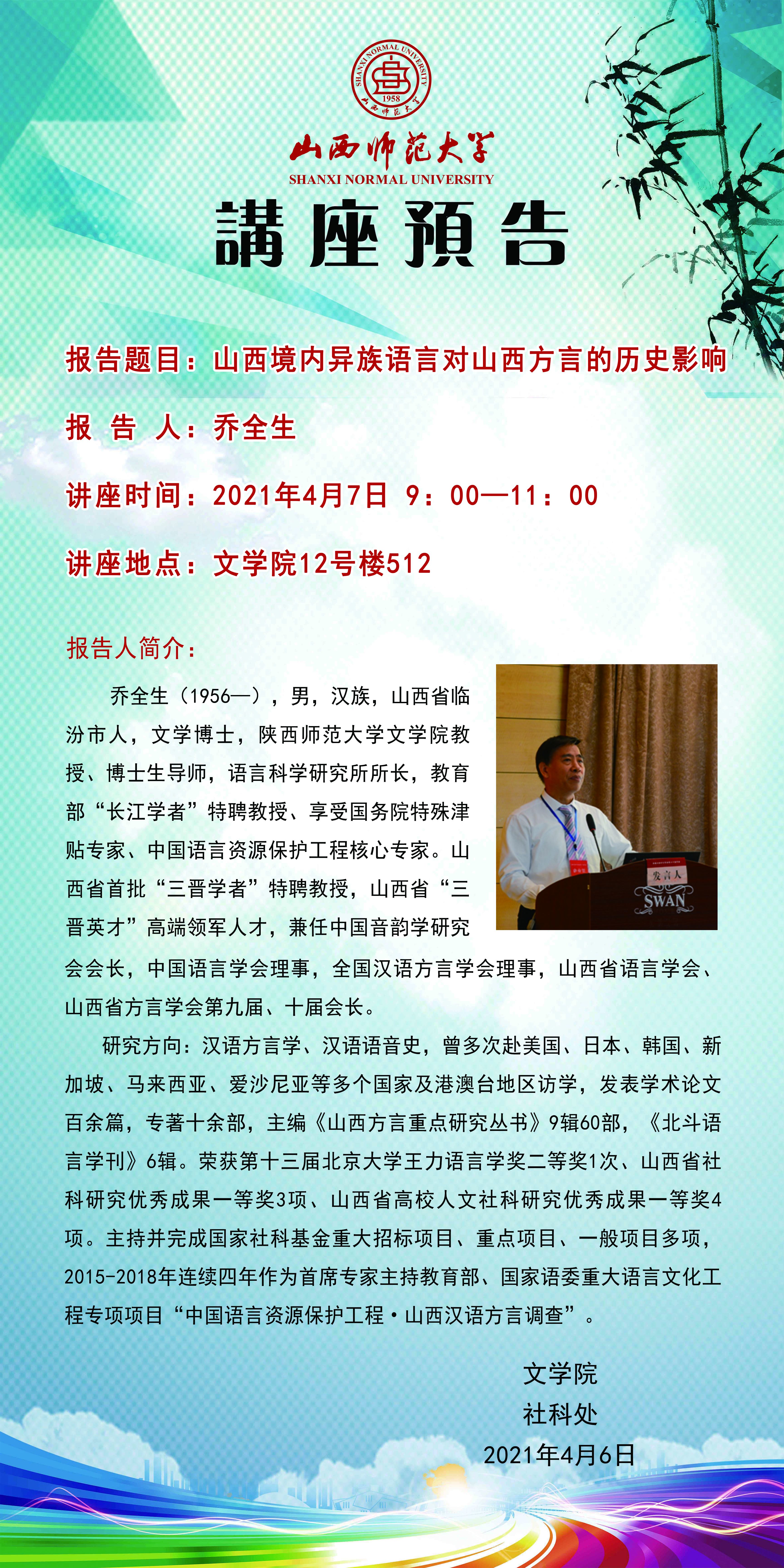 【预告】陕西师范大学乔全生教授应文学院邀请来威尼斯官网作学术报告