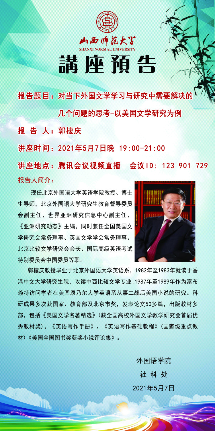 【预告】北京外国语大学英语学院郭棲庆教授应外国语学院邀请来威尼斯官网作学术报告