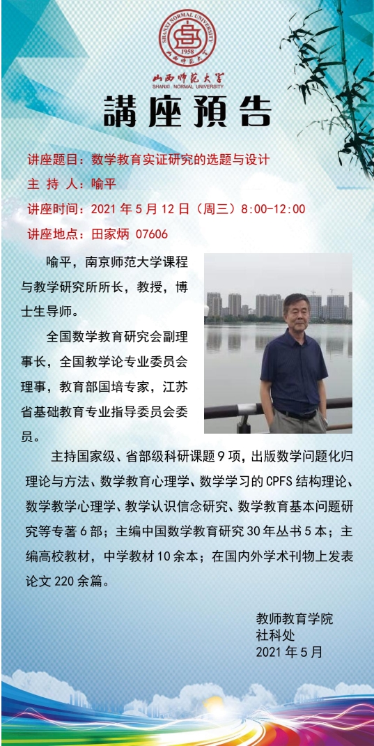 【预告】南京师范大学课程与教学研究所所长喻平教授应教师教育学院邀请来威尼斯官网作学术报告