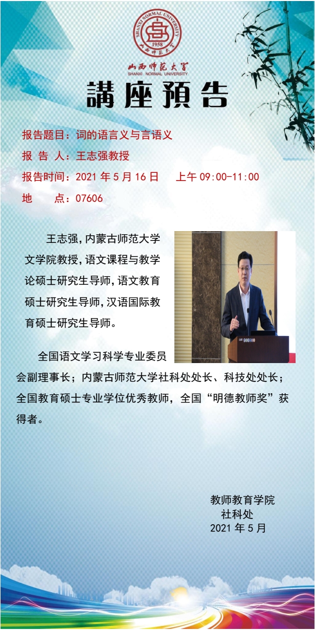 【预告】内蒙古师范大学文学院王志强教授应教师教育学院邀请来威尼斯官网作学术报告