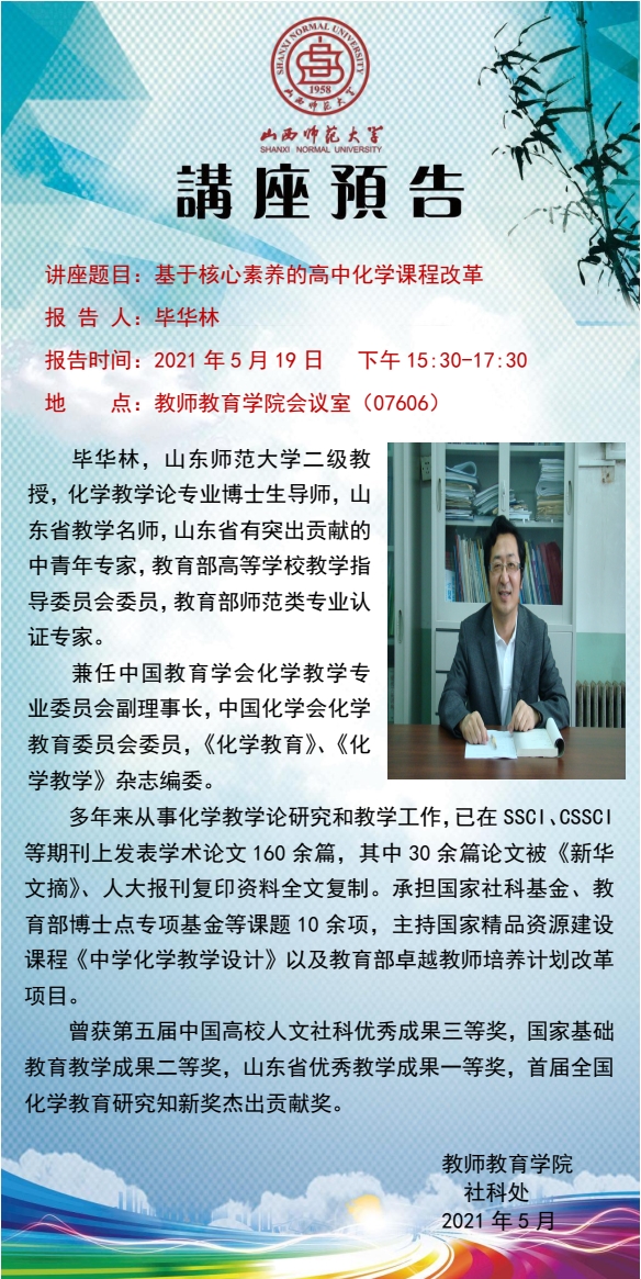 【预告】山东师范大学毕华林教授应教师教育学院邀请来威尼斯官网作学术报告