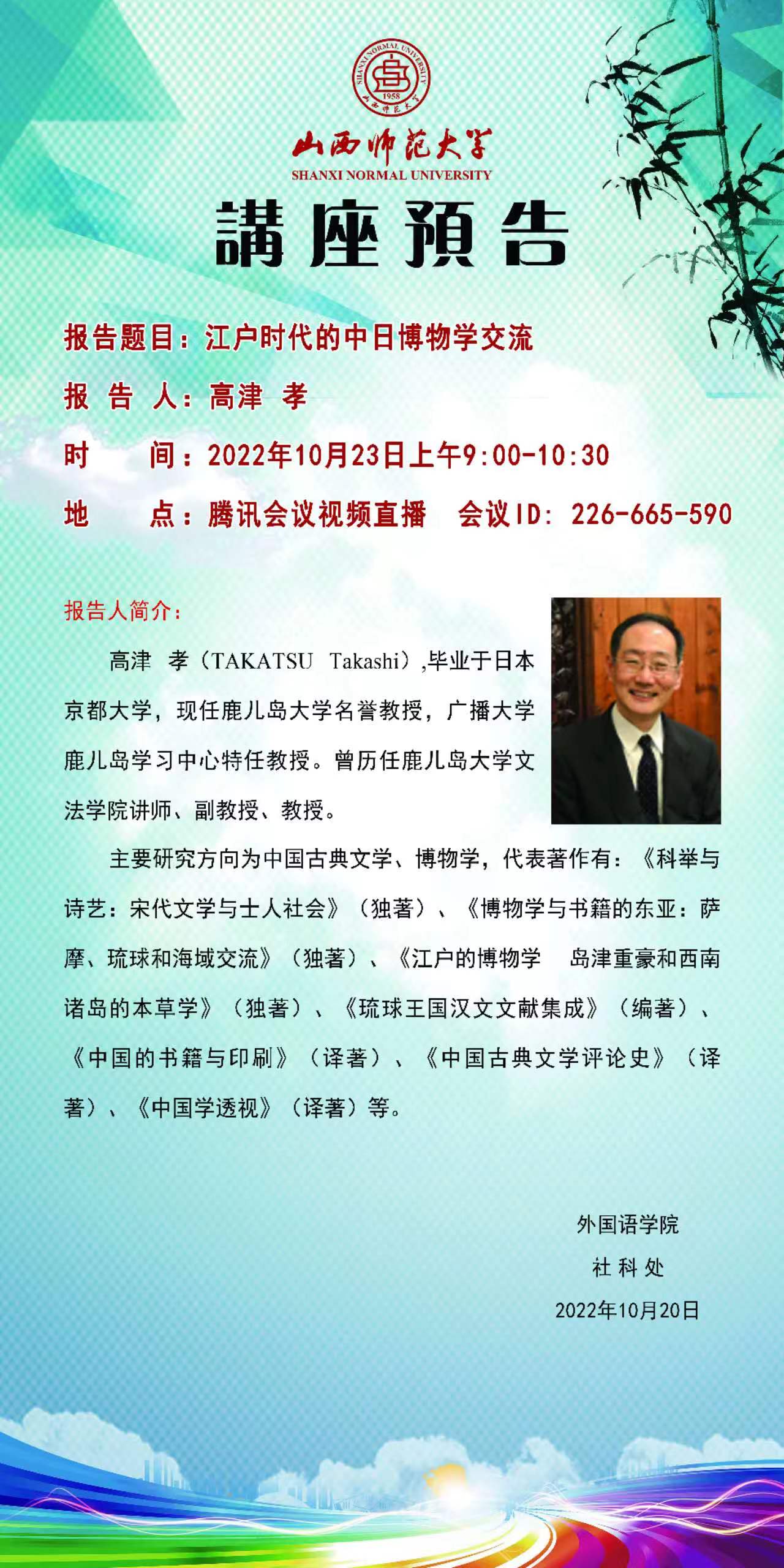 【预告】鹿儿岛大学名誉教授高津孝应威尼斯官网邀请做线上学术报告