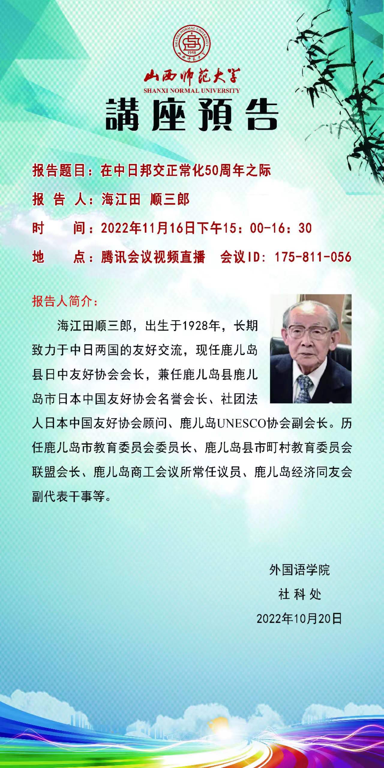 【预告】日本鹿儿岛县日中友好协会海江田顺三郎会长应威尼斯官网邀请做线上学术报告