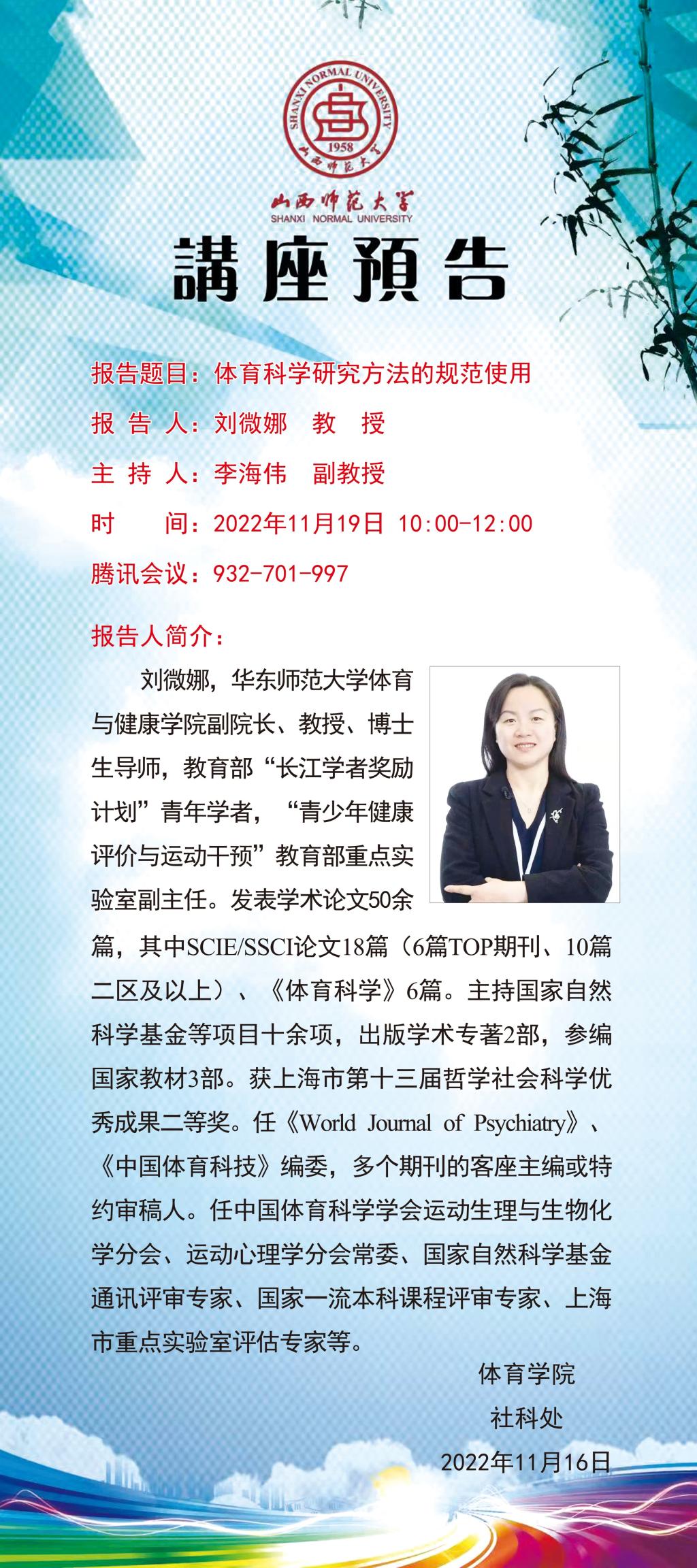 【预告】华东师范大学体育与健康学院刘微娜教授应威尼斯官网体育学院邀请作线上学术报告