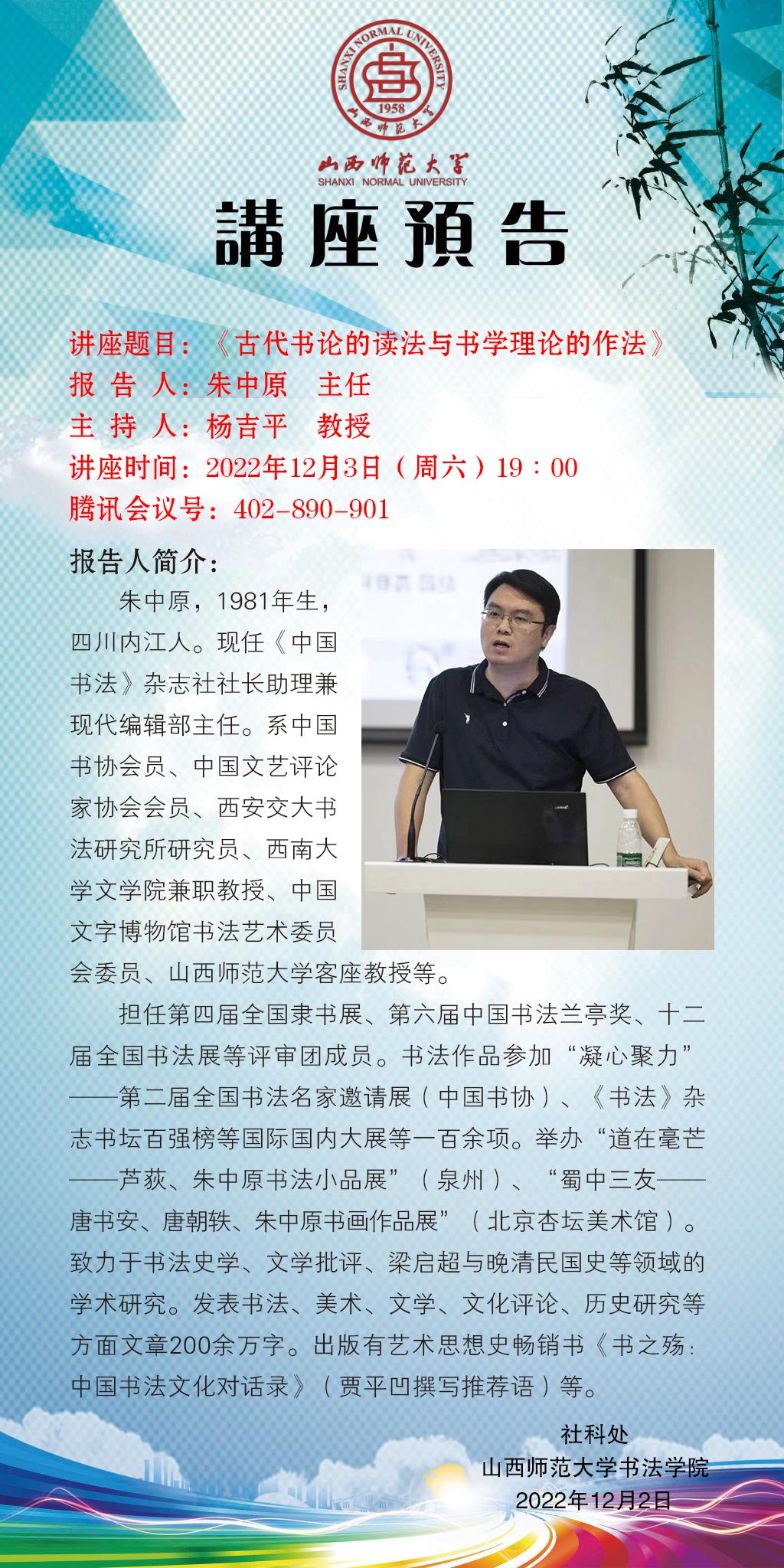 【预告】《中国书法》杂志社社长助理朱中原应威尼斯官网书法学院邀请作线上学术报告