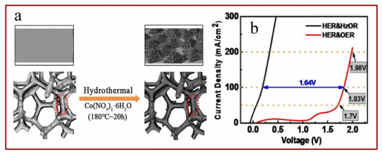 图2. a.Co3O4/Co催化剂合成示意图;b.双电极LSV性能曲线。