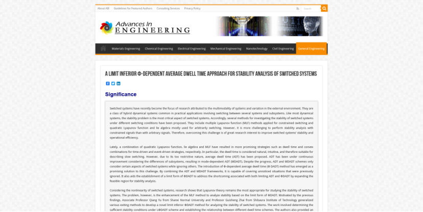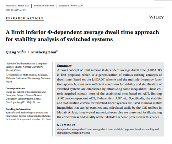 近日,8040威尼斯最佳登录数计学院玉强副教授在控制领域著名Top期刊International Journal of Robust and Nonlinear Control上发表的论文“A limit inferiorΦ-dependentaverage dwell time approach for stability analysis of switched systems”被国际著名工程科技新闻网站Advances In Engineering(AIE)评选为工程科技领域的“Key Scientific Article(关键科学论文)”,并在general Engineering栏目予以专题报道。玉强副教授为该论文的第一作者兼通讯作者,日本芝浦工业大学的翟贵生教授为该文另一合作者。